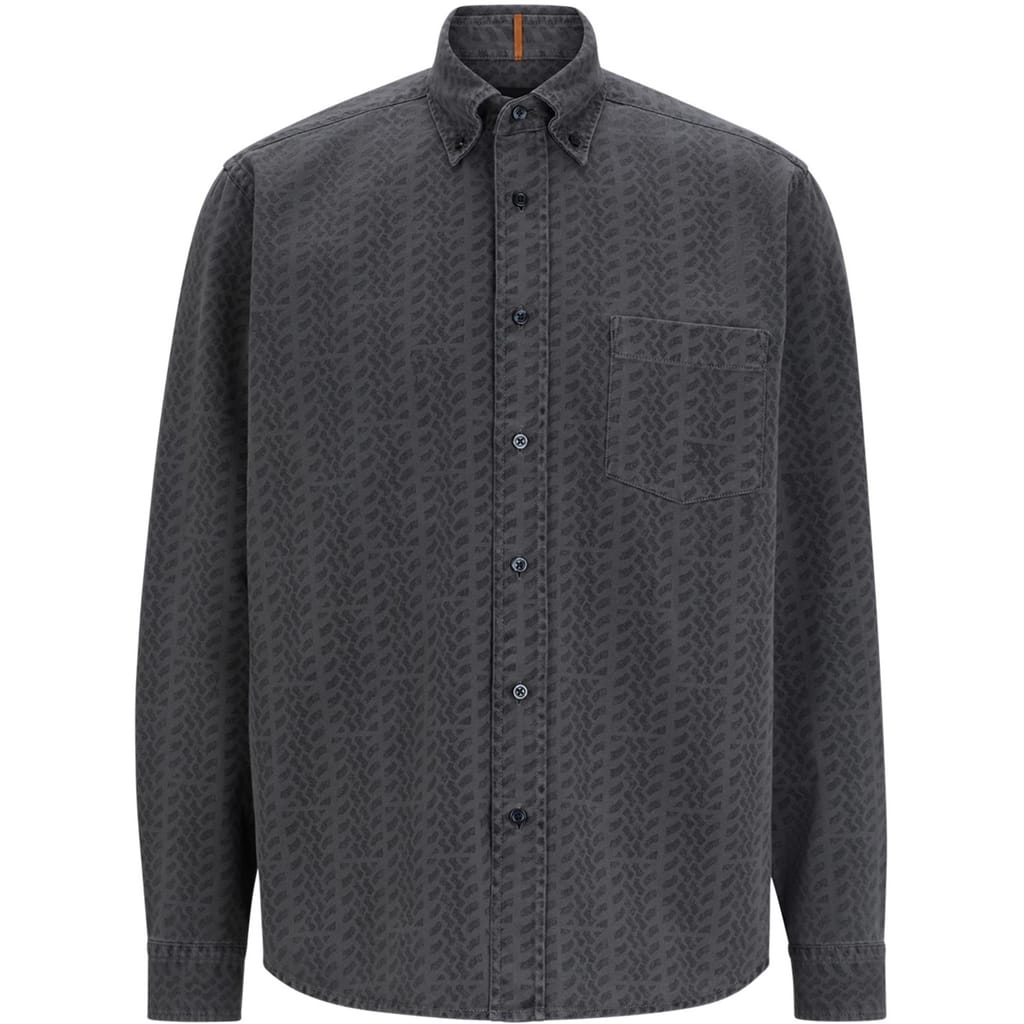This Boss top features a geometric pattern, perfect for casual occasions. It has long sleeves with cuff detailing and a regular fit, offering both style and comfort. The button closure adds a classic touch, while the pocket embellishment provides a practical element. Ideal for those seeking a blend of sophistication and everyday wear. -