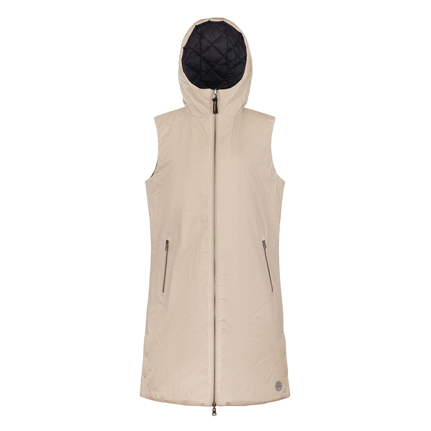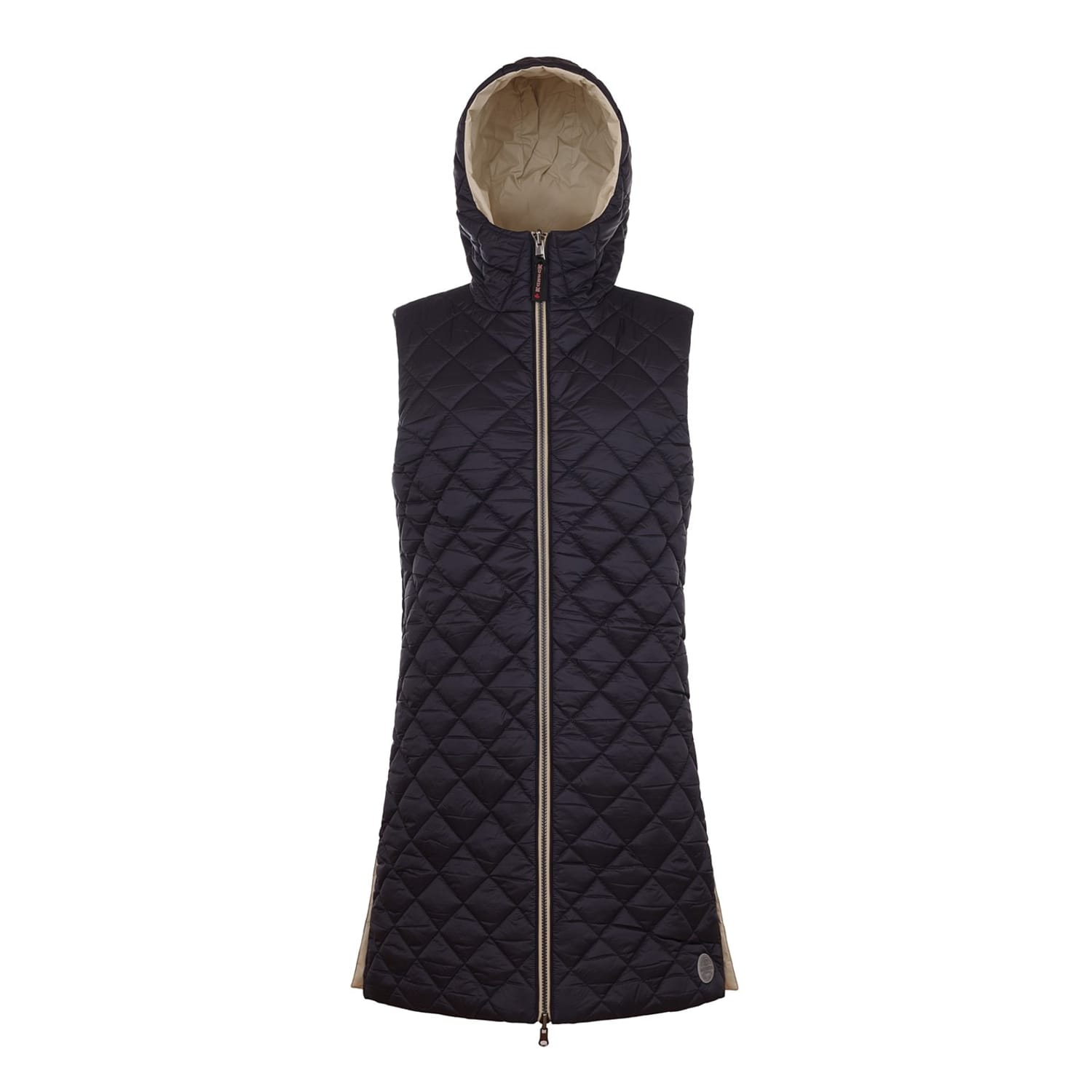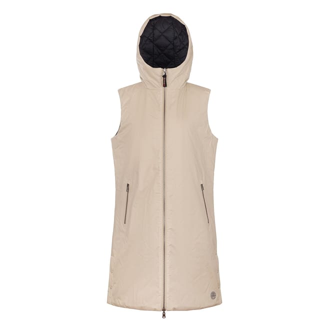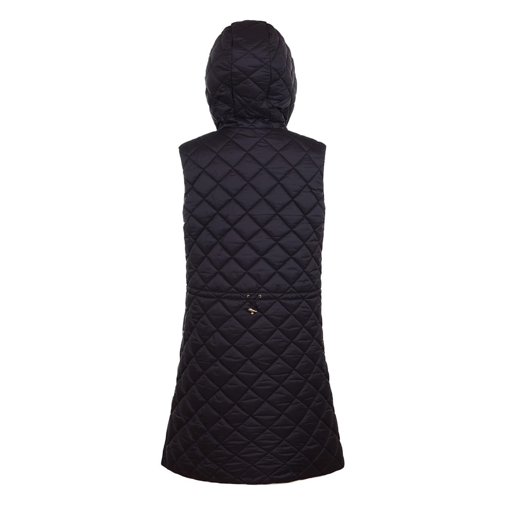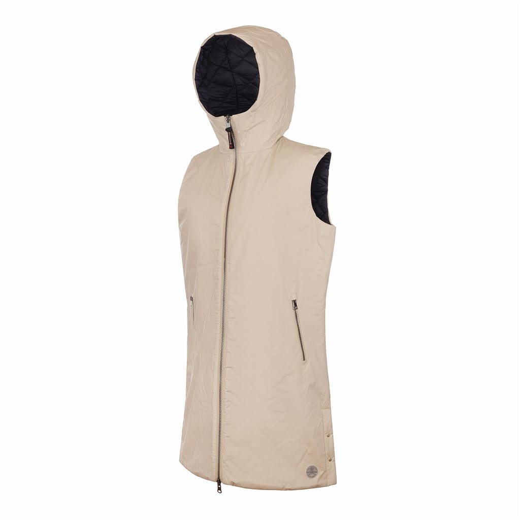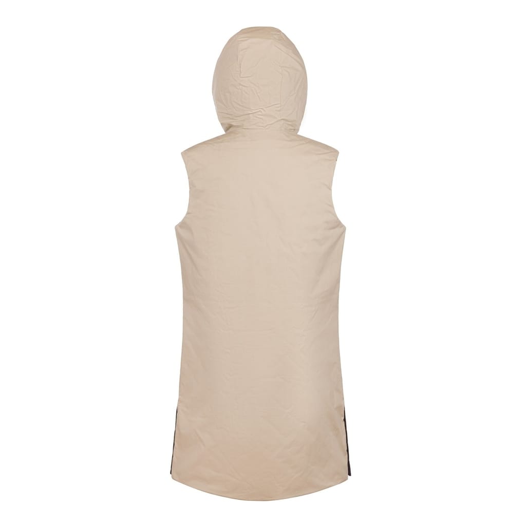 Discover the Museum gilet, a stylish sleeveless piece featuring a hooded neckline and a practical zipper closure. Its solid pattern and curved hem add a touch of sophistication, making it a versatile addition to your wardrobe. -
