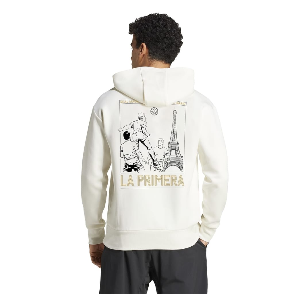Celebrate Real Madrid’s historic first European Cup victory in Paris with adidas Real Madrid Hoodie. Featuring a commemorative motif of Los Blanco's triumph in Paris on the back and finished with the club’s iconic initials embroidered on the chest, it’s perfect for showing your pride in timeless style. Completed in the signature solid colourway, it's perfect for the match, on casual days out, or while relaxing at home.