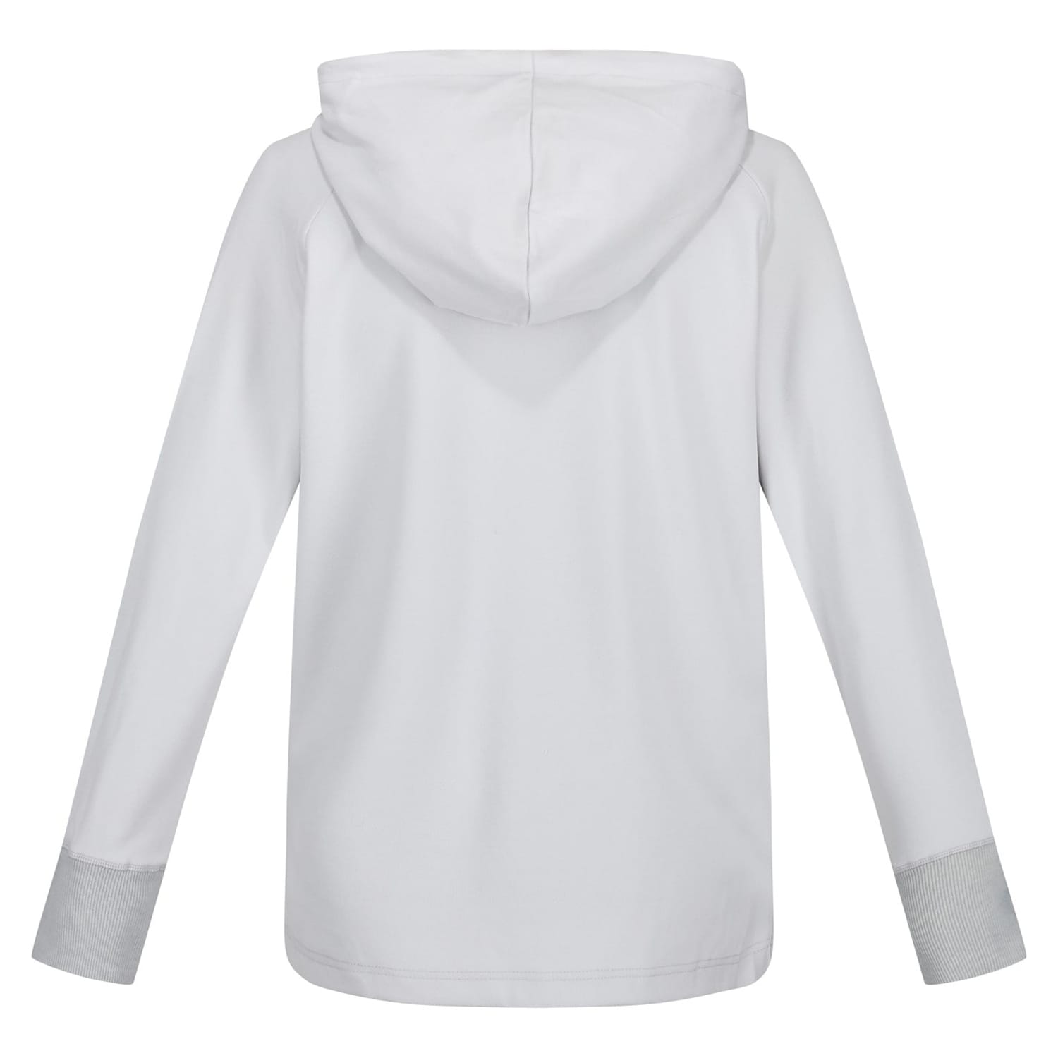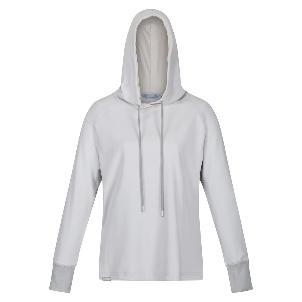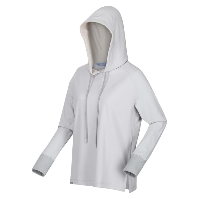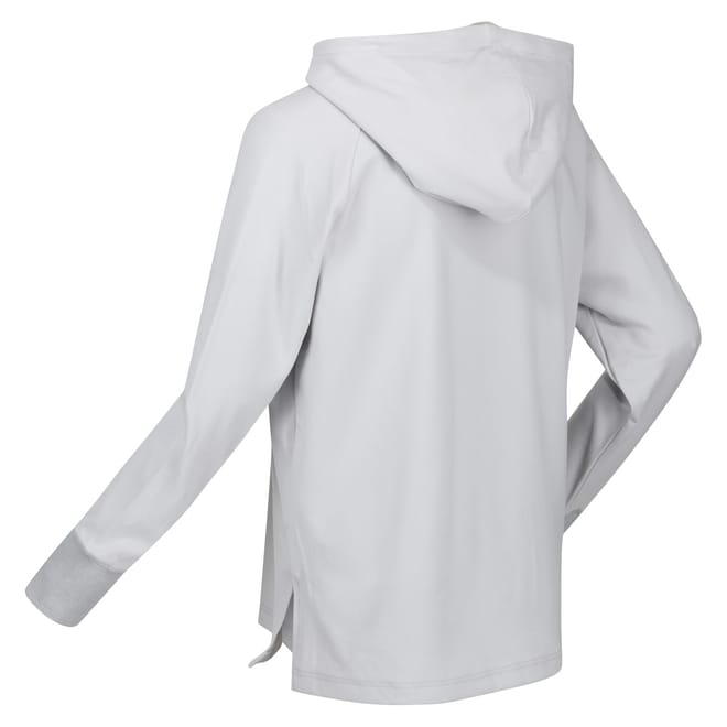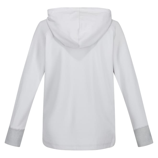This Regatta top is a casual essential featuring a hooded neck and raglan long sleeves. Designed with a relaxed fit, it offers comfort and style. The solid pattern is complemented by a logo embellishment, while ribbed cuffs add a touch of detail. Ideal for everyday wear. -