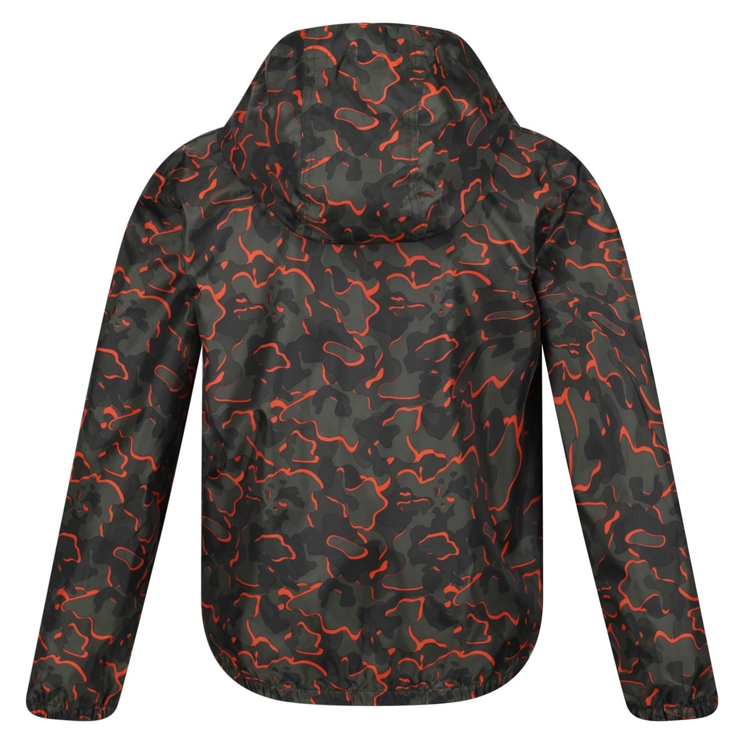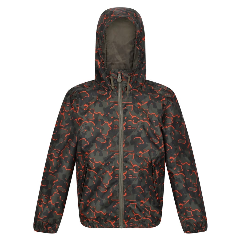 Stay dry with Regatta's water-repellent jacket, featuring a camo pattern. This relaxed fit design includes a hooded neckline and a zipper closure for convenience. The jacket is equipped with elasticated cuffs and hem for a snug fit, while pockets add functionality. Ideal for rainy days, it combines style and practicality effortlessly. -