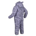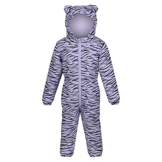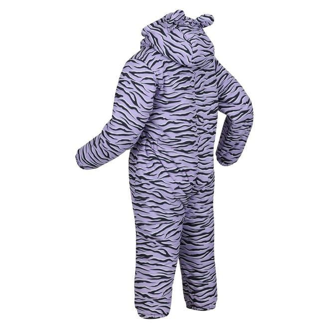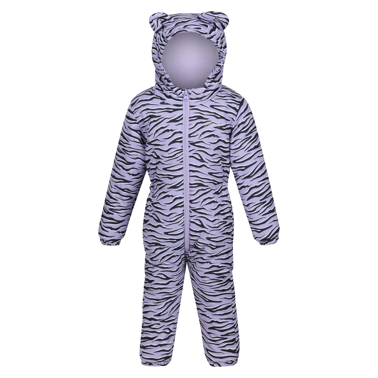 Stay protected with Regatta's water-repellent snowsuit, featuring a hooded neck and long plain sleeves. This regular fit jumpsuit is designed with a front zipper closure for easy wear. The striking tiger and zebra patterns add a unique touch to this practical piece, perfect for braving the elements. -