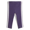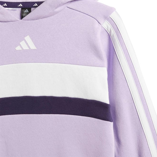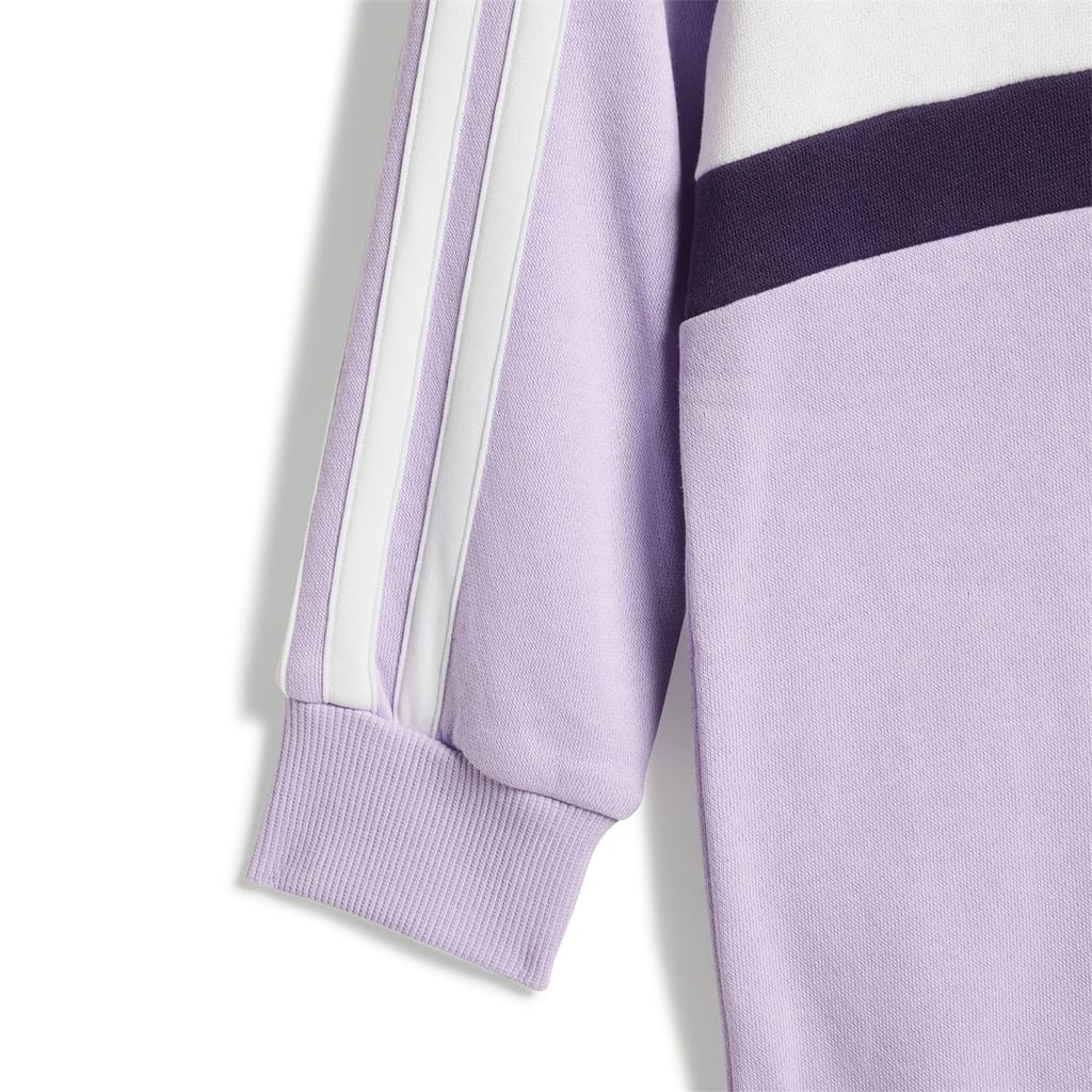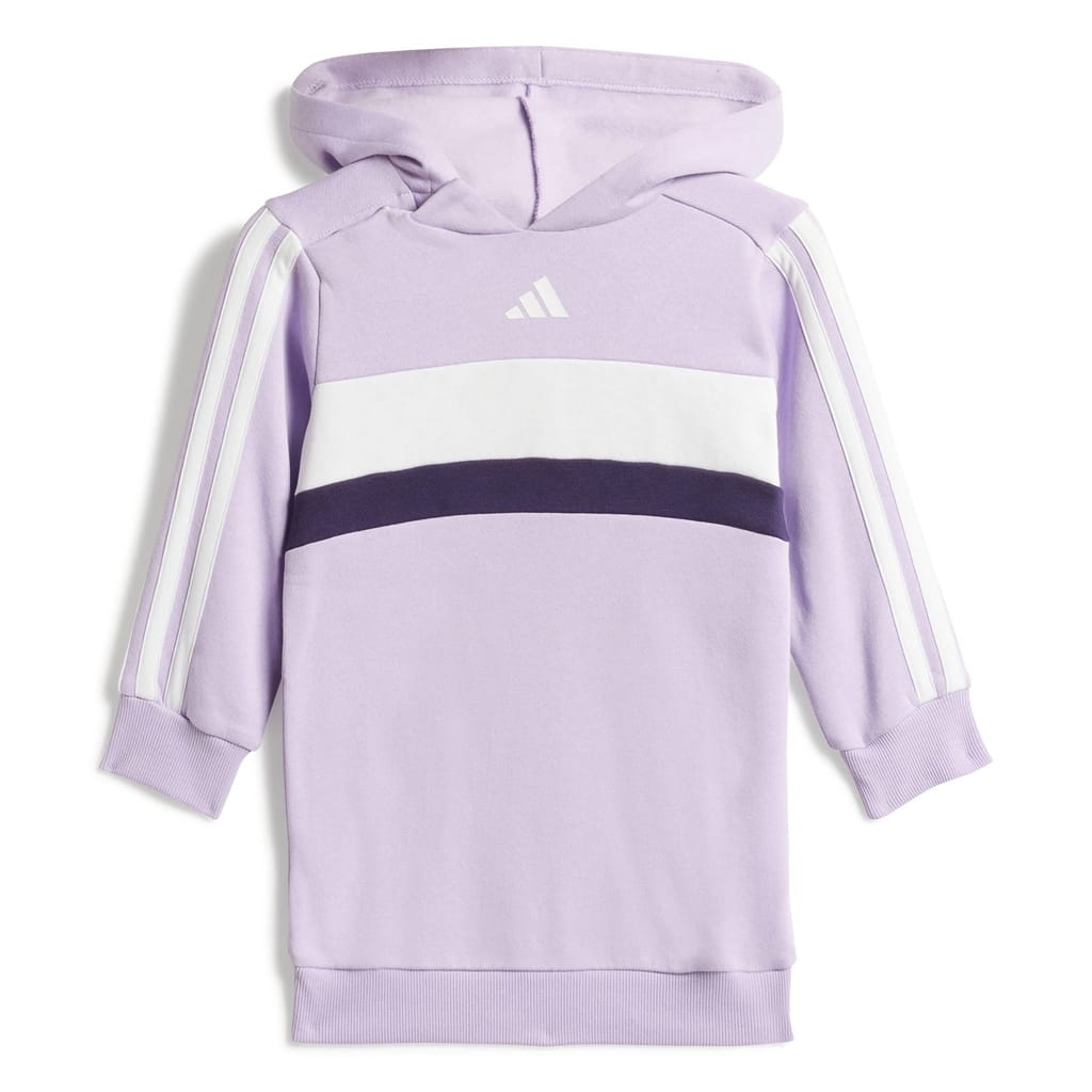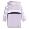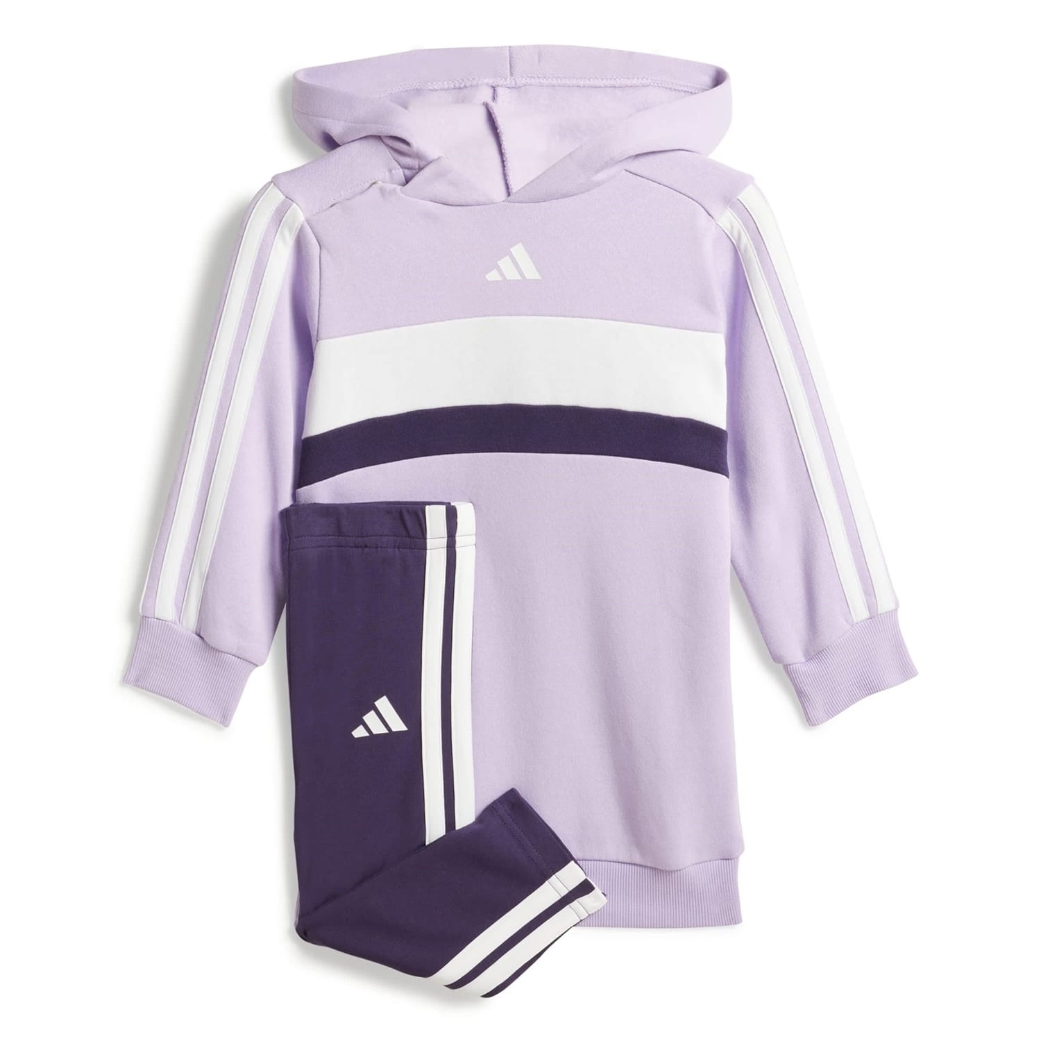 This adidas full track suit features a hooded neck and long raglan sleeves, offering a comfortable fit. The set includes a hoodie with the iconic three stripes pattern and side stripes, complemented by athletic leggings. The ensemble is adorned with the adidas logo, ensuring a stylish and sporty look. -