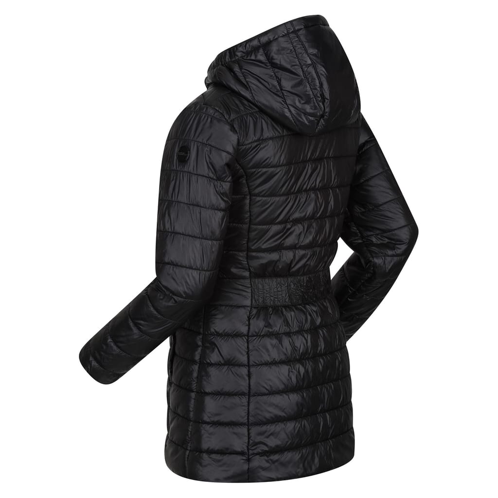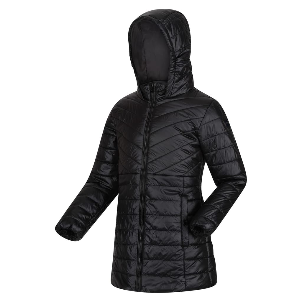 The Regatta puffer jacket is designed for optimal warmth with its insulated build. Featuring a hooded neckline and a zipper closure, it ensures comfort and protection against the elements. The jacket has a regular fit and a straight hem, complemented by a solid pattern and a subtle logo embellishment, making it a practical choice for cooler seasons. -