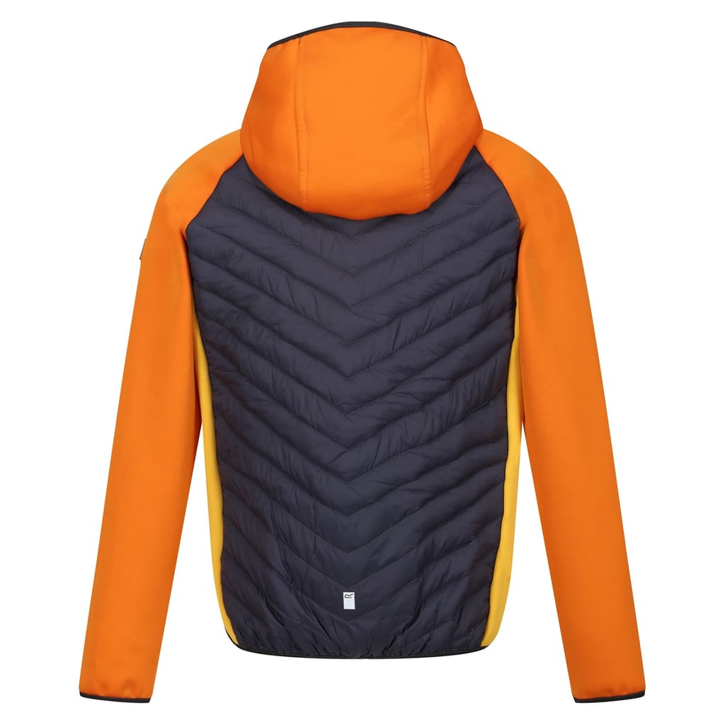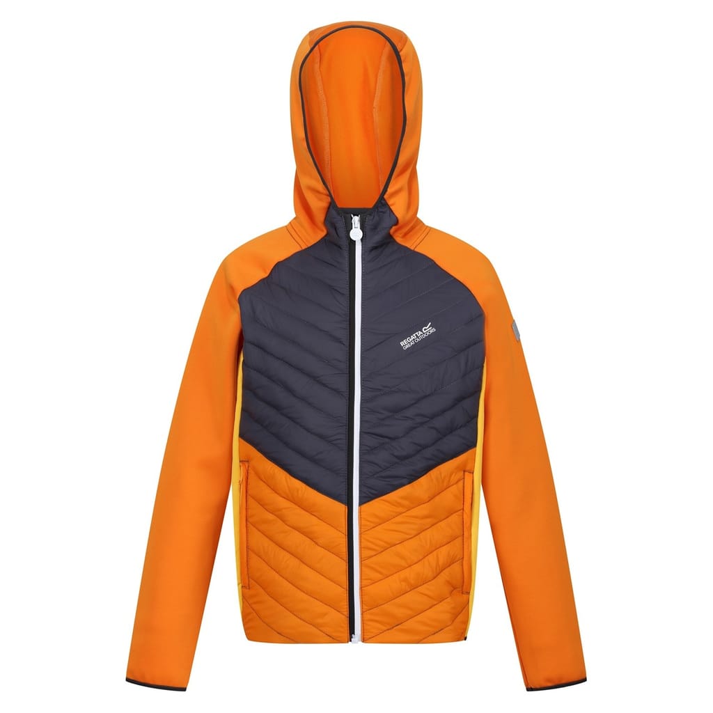 This Regatta hybrid jacket features a hooded neckline and a zipper closure, offering a regular fit. The jacket is insulated for added warmth and showcases a stylish color block pattern. Raglan sleeves with elasticated cuffs provide comfort and flexibility. The design is completed with a logo embellishment, making it a practical and fashionable choice for cooler weather. -
