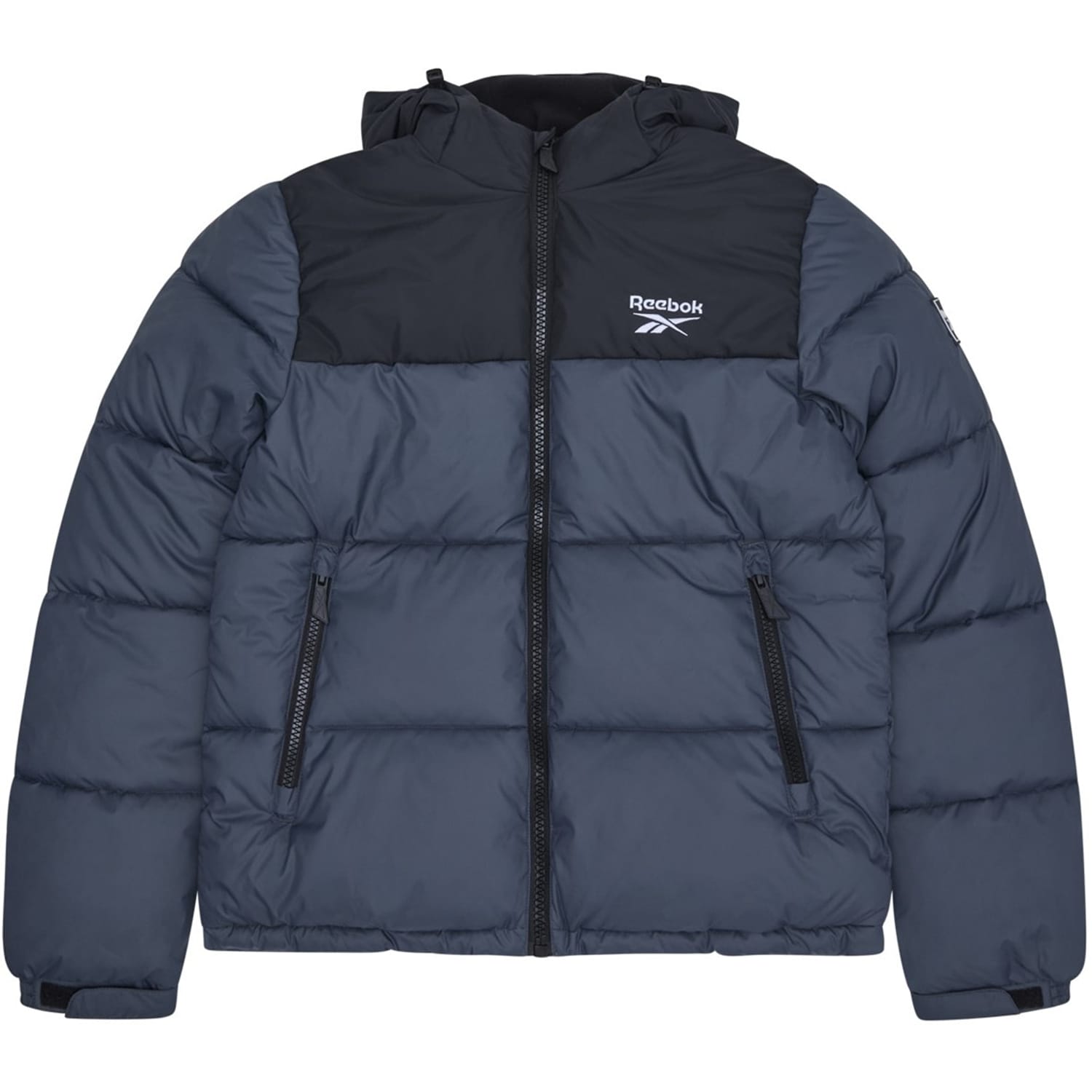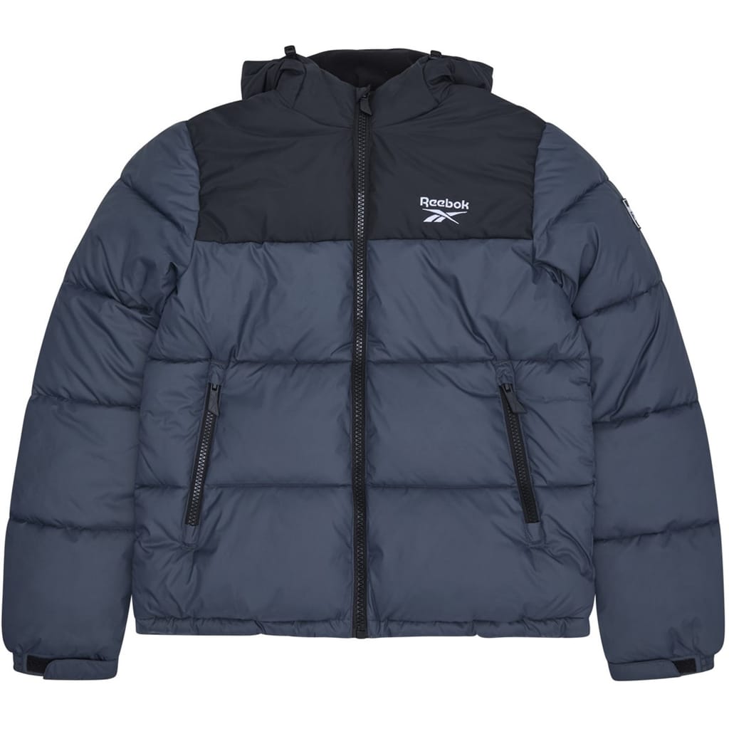 This Reebok puffer coat features a hooded neckline and a straight hem. Designed with a solid pattern, it offers a regular fit and includes a zipper closure. The coat is embellished with a logo, adding a distinctive touch to its heavyweight design. -