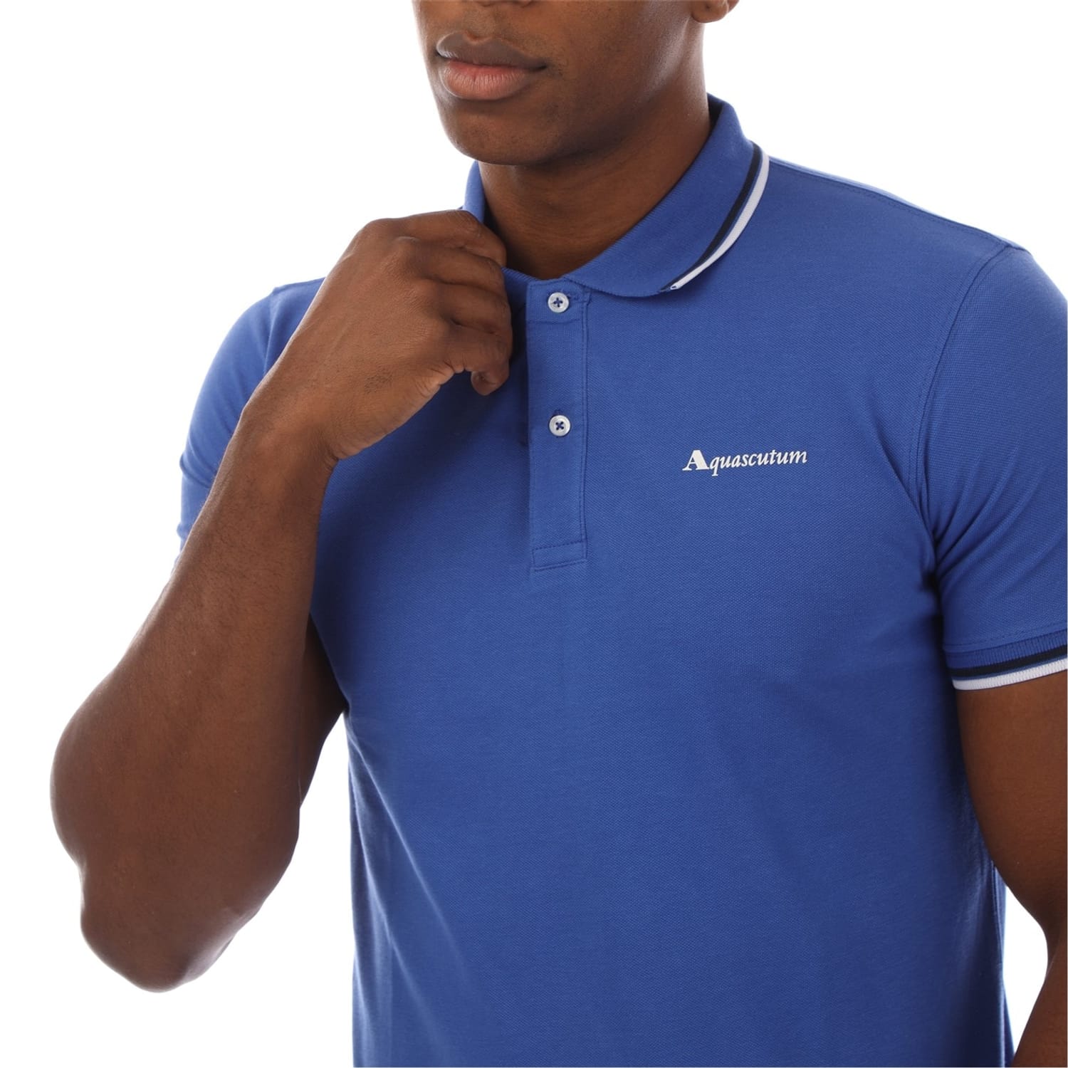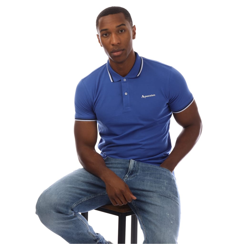 This Aquascutum top features a classic polo collar and a button closure, offering a refined look. The short sleeves and ribbed cuffs add a touch of sophistication, while the slim fit ensures a sleek silhouette. The solid pattern is complemented by a subtle logo embellishment, making it a versatile addition to any wardrobe. -