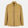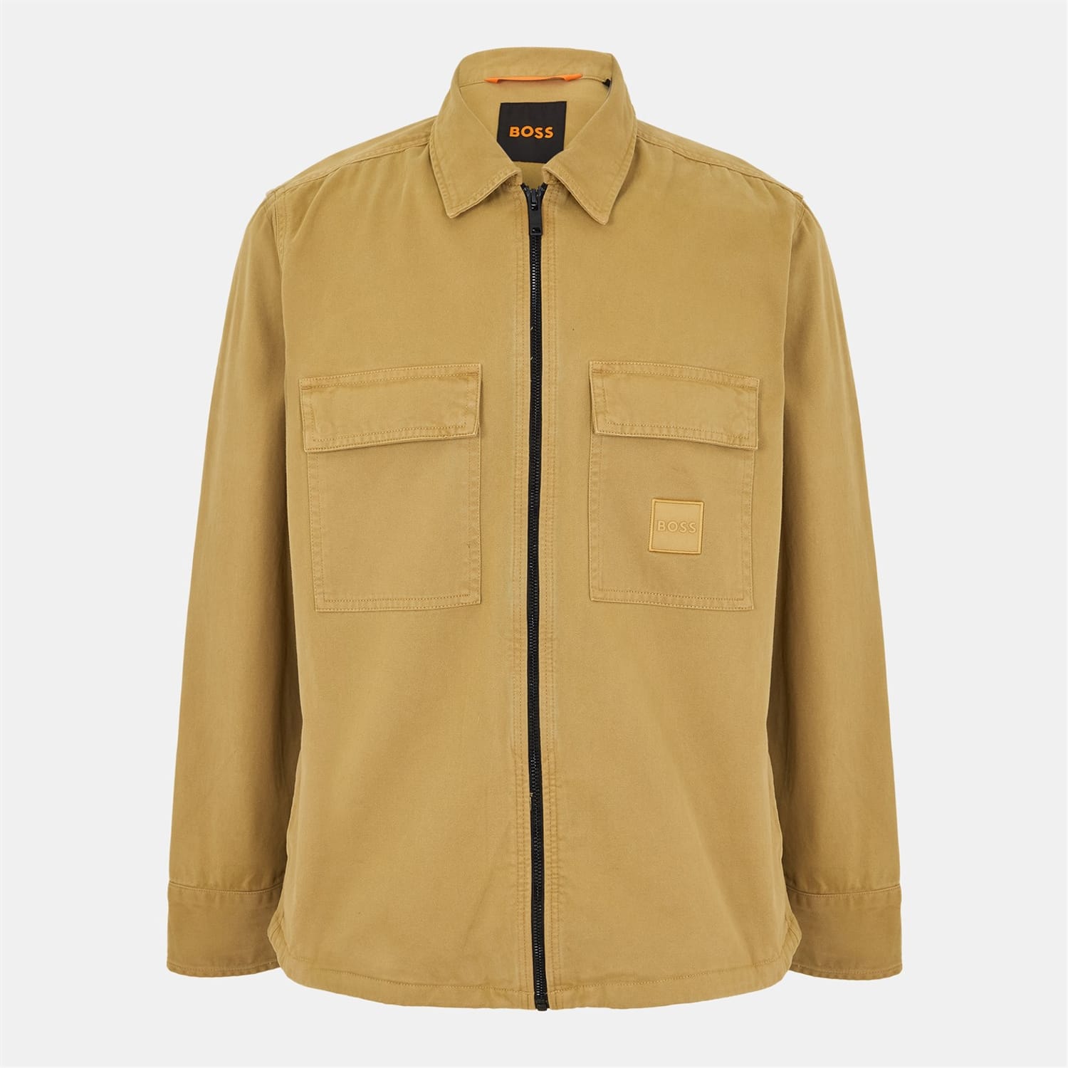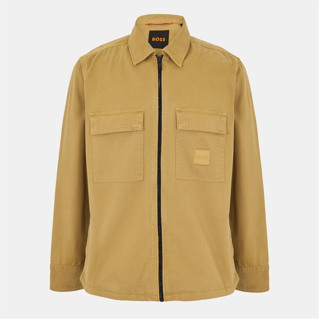 This Boss overshirt features a regular fit with a shirt collar and cuff sleeves. The solid pattern is complemented by a straight hem and practical pockets. The design includes a logo embellishment, adding a touch of brand identity. The jacket is secured with a combination of zipper and snap button closures, offering both style and functionality. -
