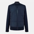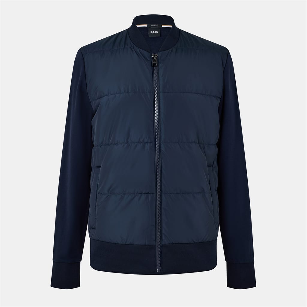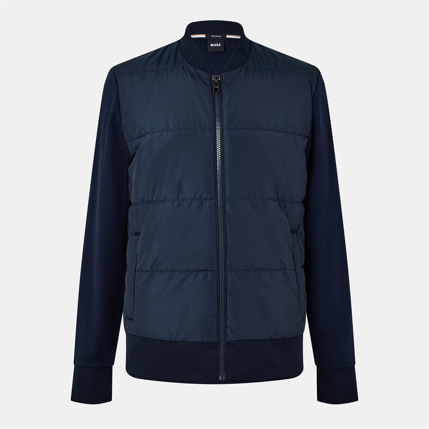 This Boss hybrid jacket features a solid pattern with a regular fit. It is designed with a ribbed collar, cuffs, and hem, providing a comfortable and stylish look. The jacket includes a zipper closure and is embellished with a logo, adding a touch of brand identity. -