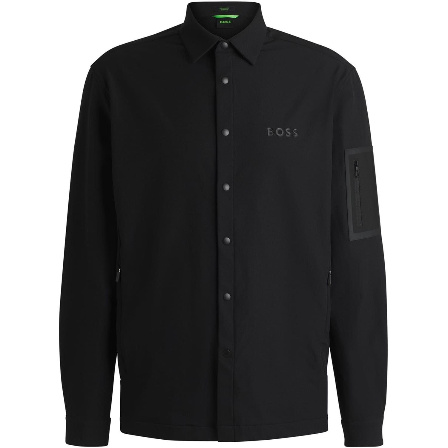 This Boss top is a casual essential, featuring a solid pattern and long sleeves. It offers a regular fit with a shirt collar and snap button closure. The design is enhanced with a logo and pocket embellishments, making it a versatile addition to any wardrobe. -