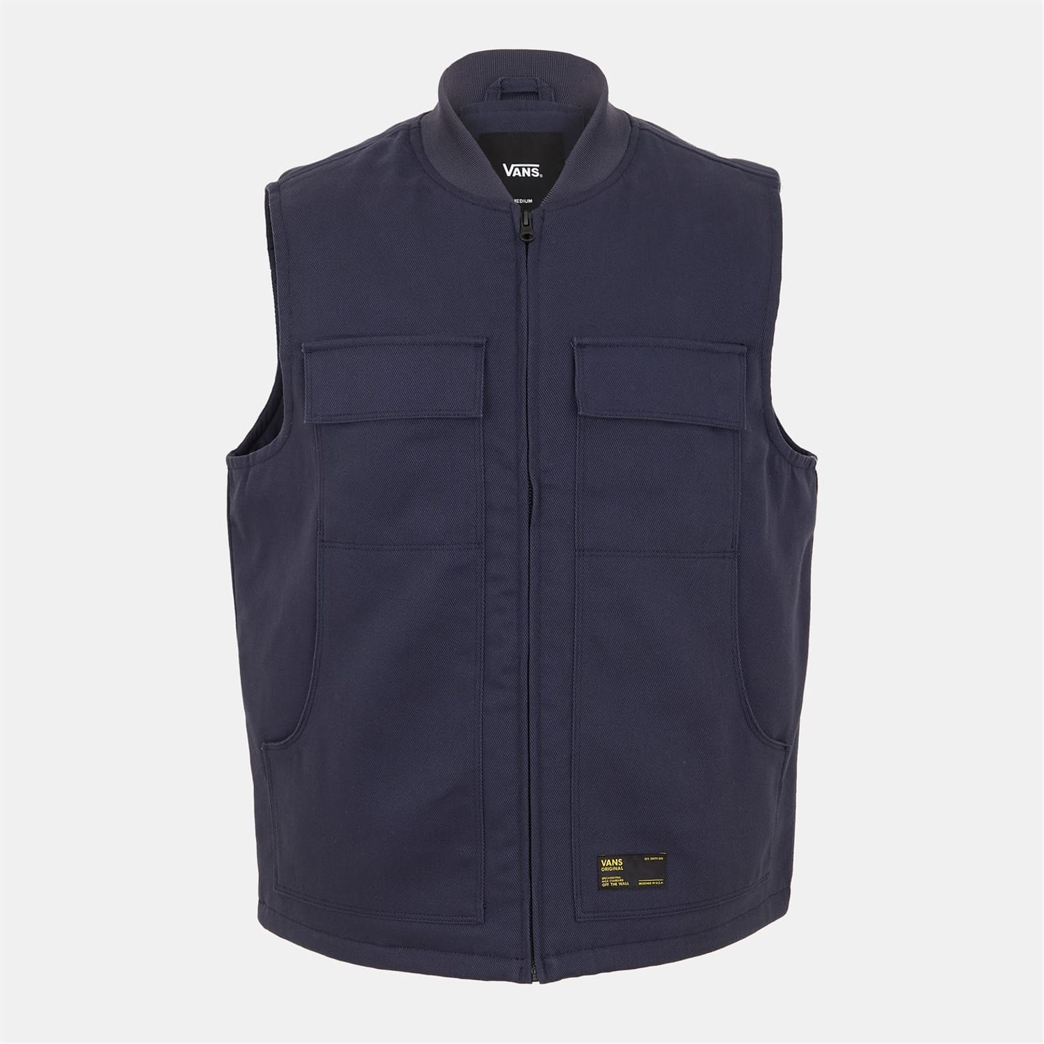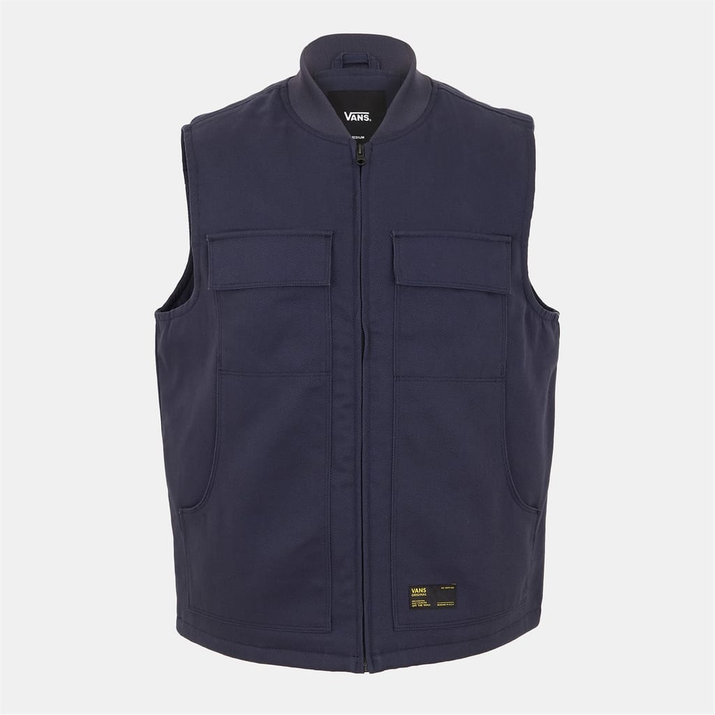 This Vans gilet features a solid pattern with a regular fit, offering a versatile addition to your wardrobe. The design includes a straight hem and a convenient zipper closure. Embellished with pockets and a logo, this piece combines functionality with a touch of brand identity. -