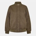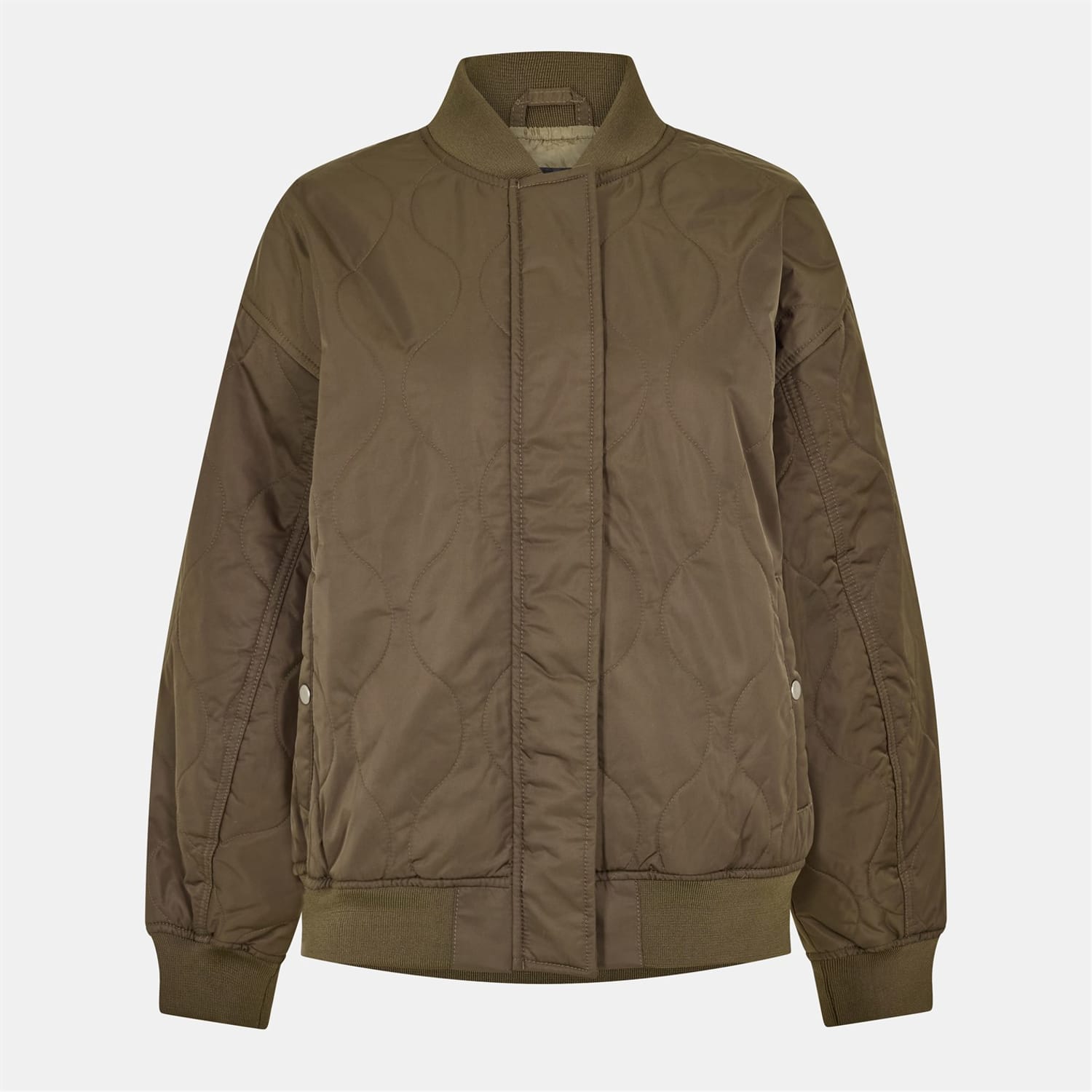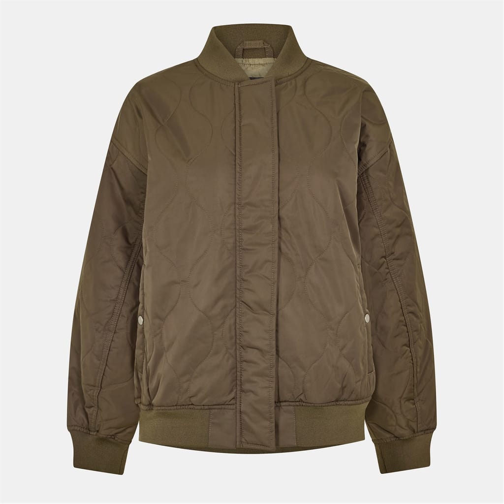 This Vans bomber jacket features a quilted design with a relaxed fit, offering both style and comfort. It includes a bomber collar and a ribbed hem, complemented by ribbed cuffs for a classic look. The solid pattern and zipper closure add to its sleek appearance, while practical pockets provide functionality. -