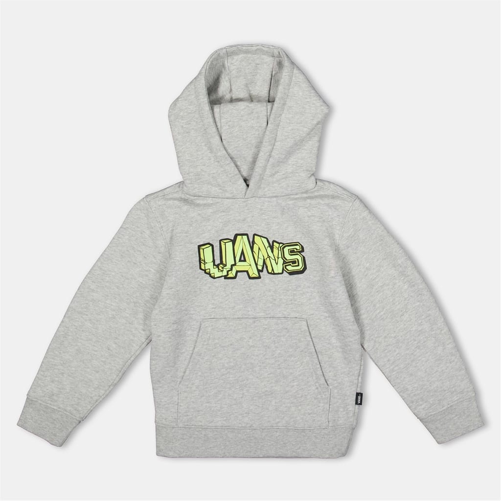 This Vans top for kids features a hooded neck and long sleeves, offering a regular fit. The heathered pattern adds a casual touch, while the ribbed cuffs ensure comfort. Embellished with a logo and kangaroo pocket, it includes lettering graphics. Suitable for all seasons, this top is perfect for a laid-back style. -