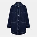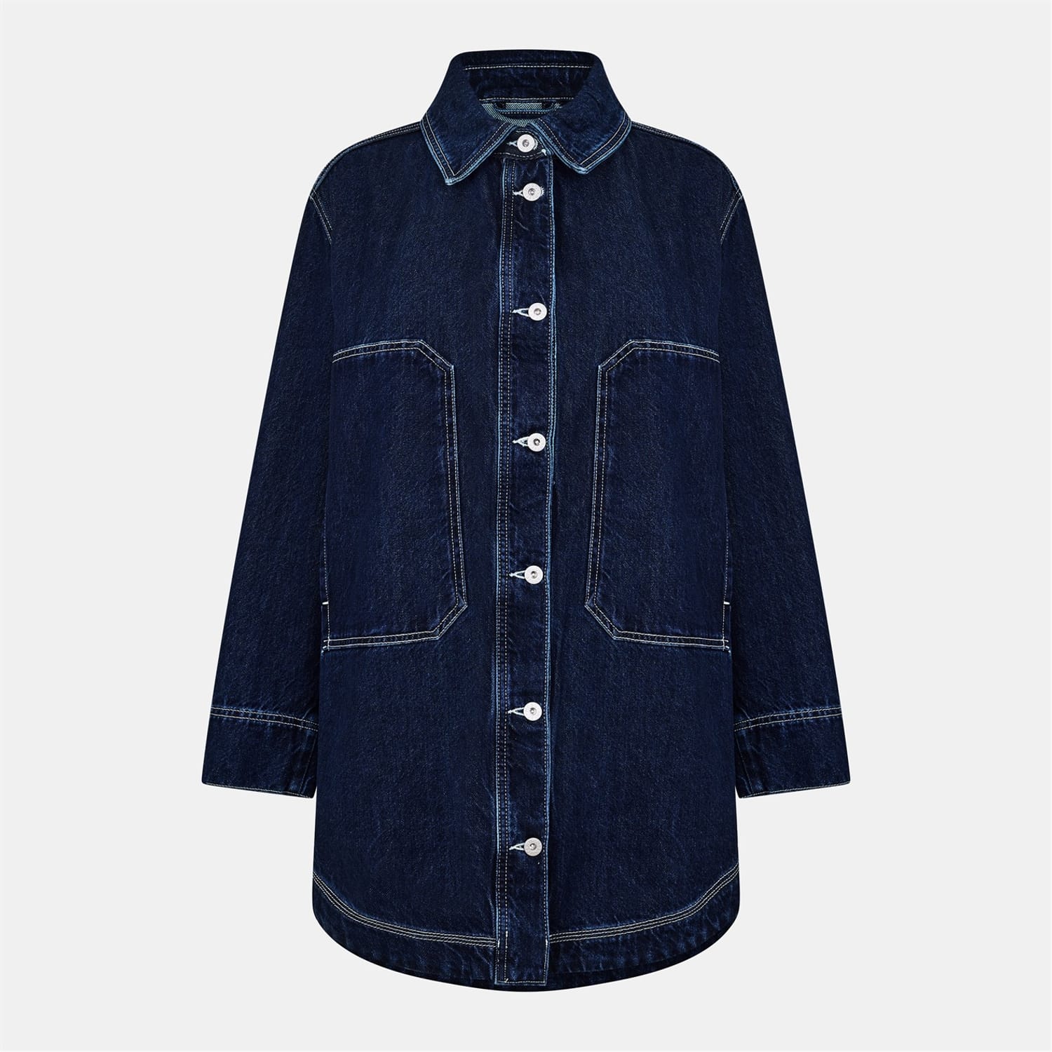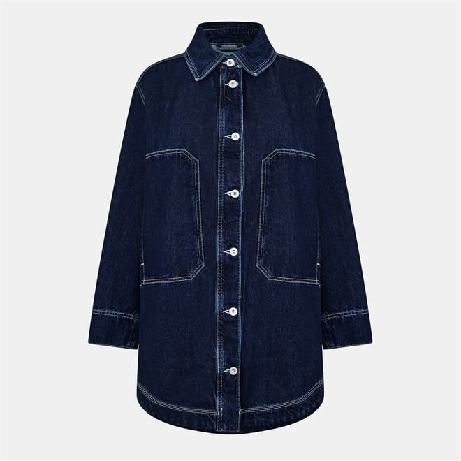 This Hugo denim jacket features a classic shirt collar and a curved hem. Designed with a regular fit, it offers a solid pattern and includes button closure. The jacket is embellished with front pockets and stitched details, adding a touch of practicality and style. -