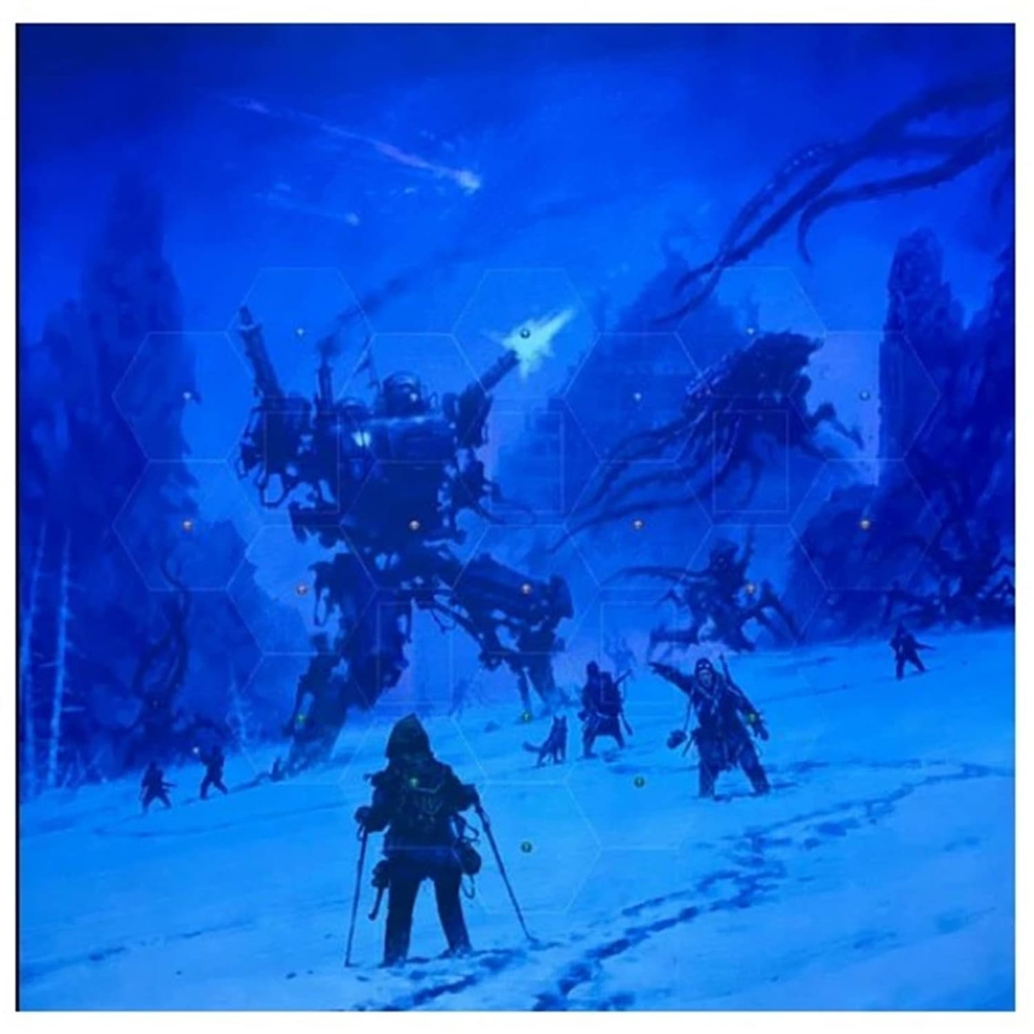 This natural rubber playmat for Expeditions has double-stitched edges for durability. It is double sided (one side with outlines for hexes, cards, and basecamp and one side just with art), and it fits the core components needed for a 5-player game (location tiles, basecamp, and mech mats), with flexible positioning for various player counts and table configurations. It measures 900x900mm. -