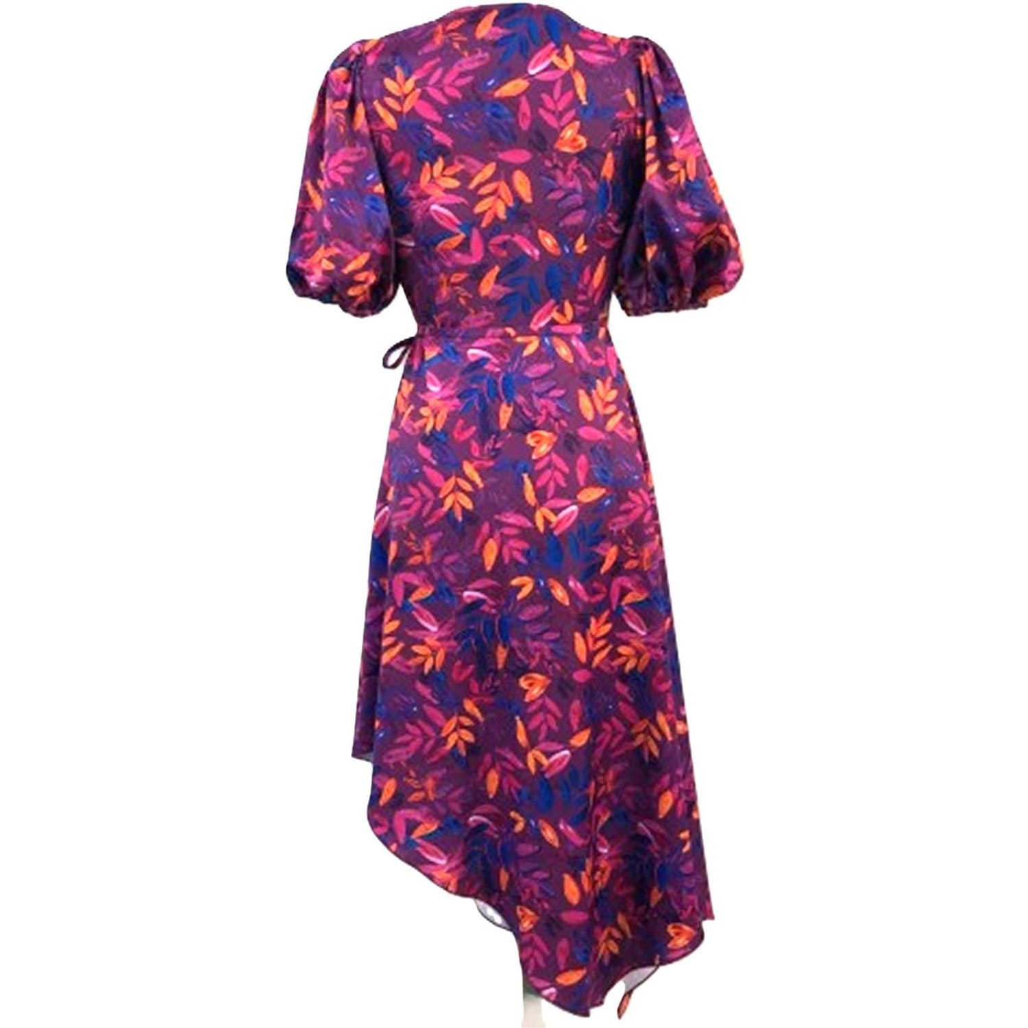This Little Mistress wrap dress features a maxi length with a floral pattern, perfect for a stylish look. The dress is designed with a V-neck and short puff sleeves, adding a touch of elegance. The asymmetrical hemline enhances its unique style, making it a standout piece for any occasion. -