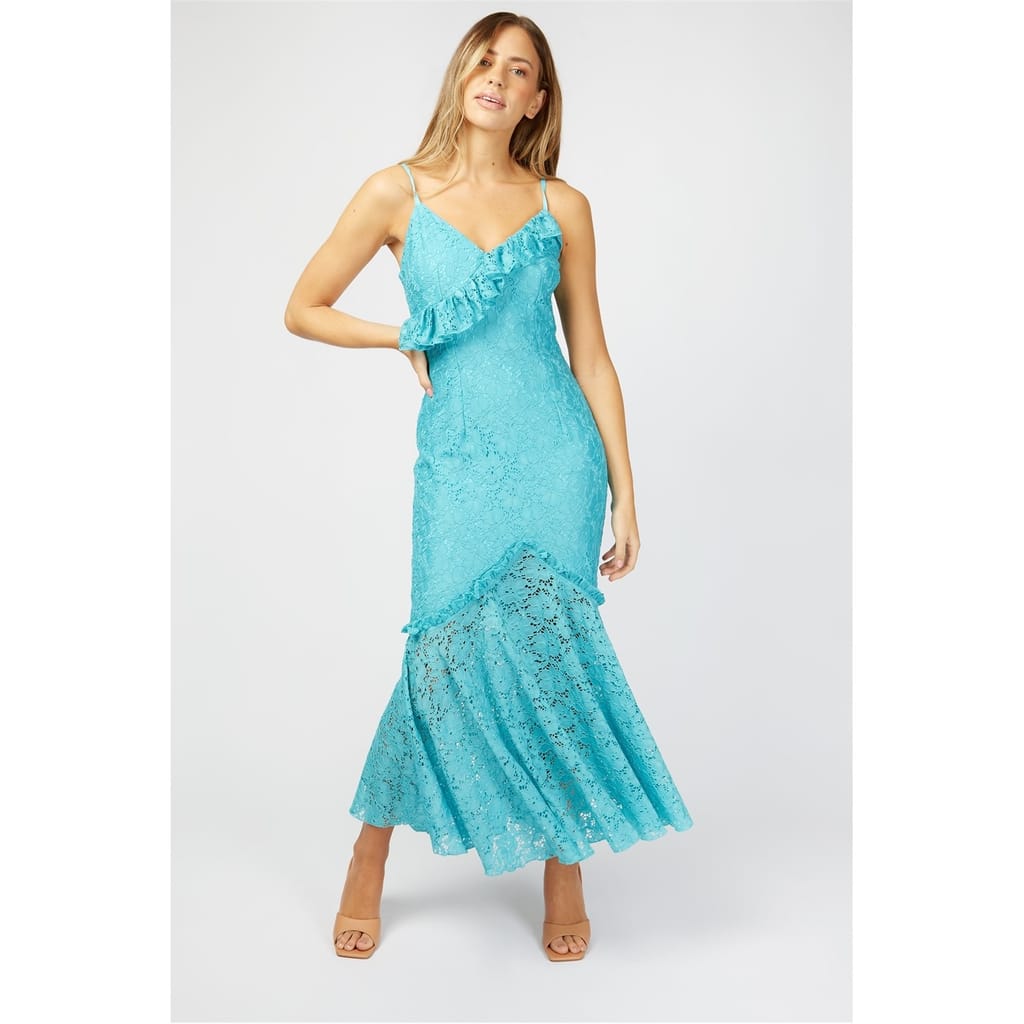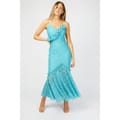 This Little Mistress maxi dress features a floral pattern with a v-neckline and a fishtail hemline. The slim fit design is enhanced by elegant ruffle embellishments, creating a sophisticated look for any occasion. -