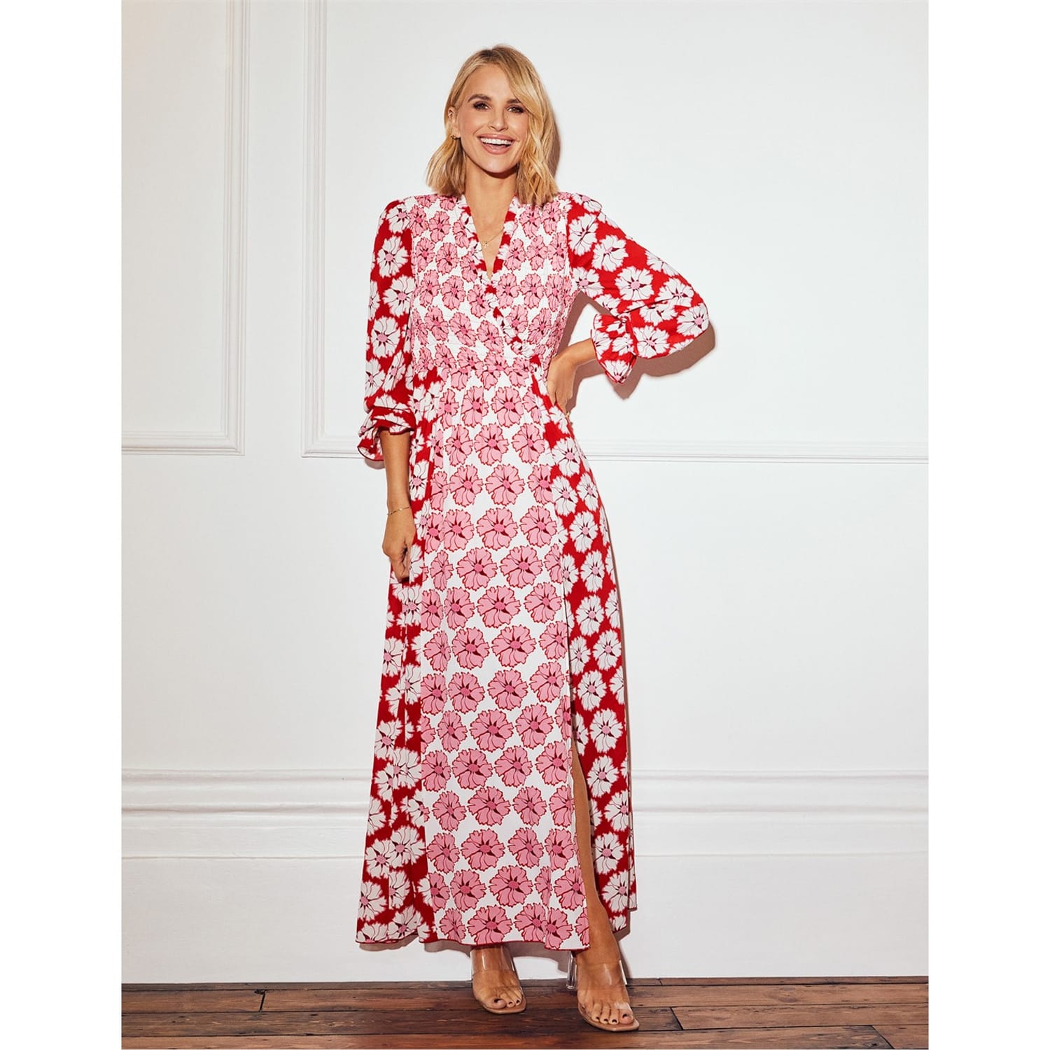 This Little Mistress wrap dress is a stunning maxi piece featuring a floral pattern. It boasts a flattering V-neck and three-quarter puff sleeves, adding a touch of elegance. The straight hemline completes the sophisticated look, making it a perfect choice for various occasions. -
