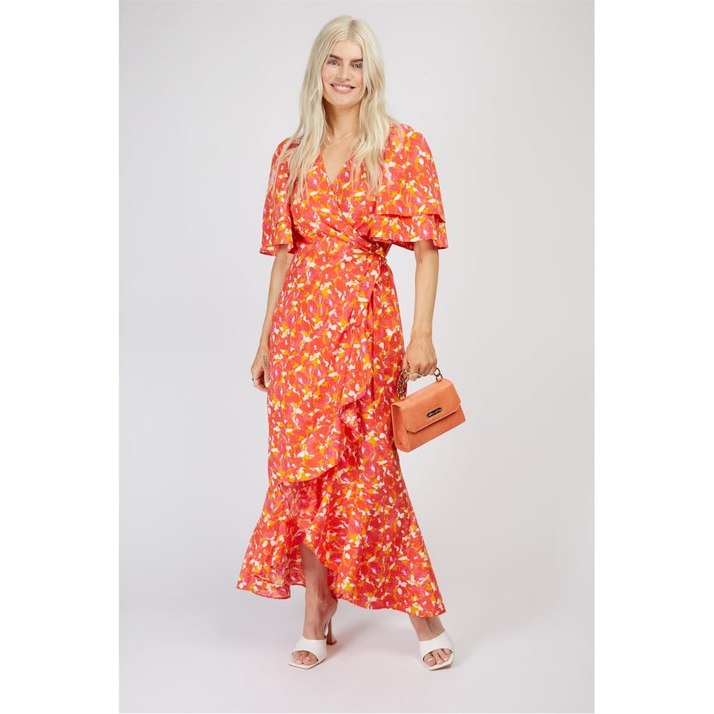 This Little Mistress wrap dress is a stunning maxi piece featuring a floral pattern. The dress boasts a flattering V-neck and flutter sleeves, adding a touch of elegance. The asymmetrical hemline and ruffle embellishments enhance its sophisticated style. A tie closure completes the look, making it a perfect choice for any occasion. -