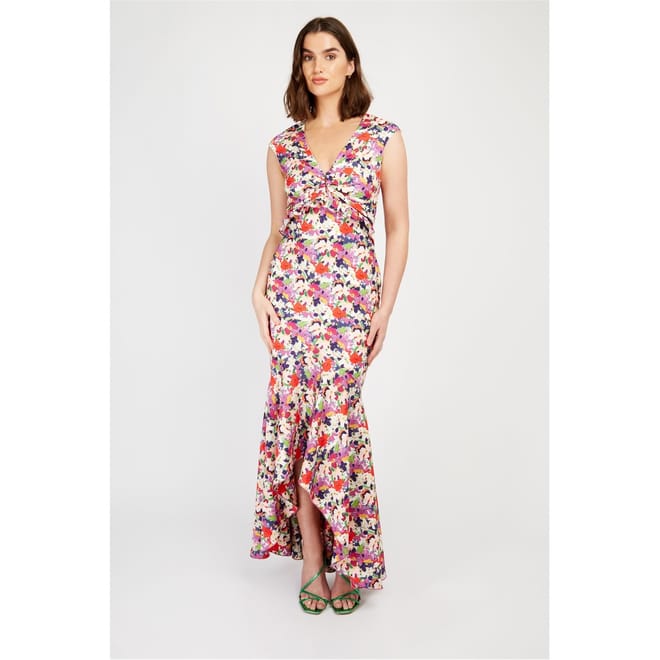 This Little Mistress maxi dress features a floral pattern with a v-neckline and a fishtail hemline. The slim fit design is enhanced by elegant ruffle embellishments, creating a sophisticated look. -