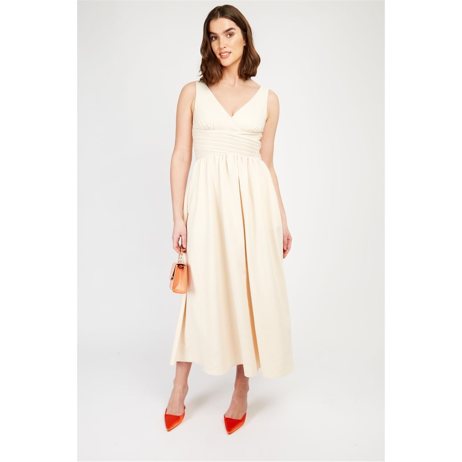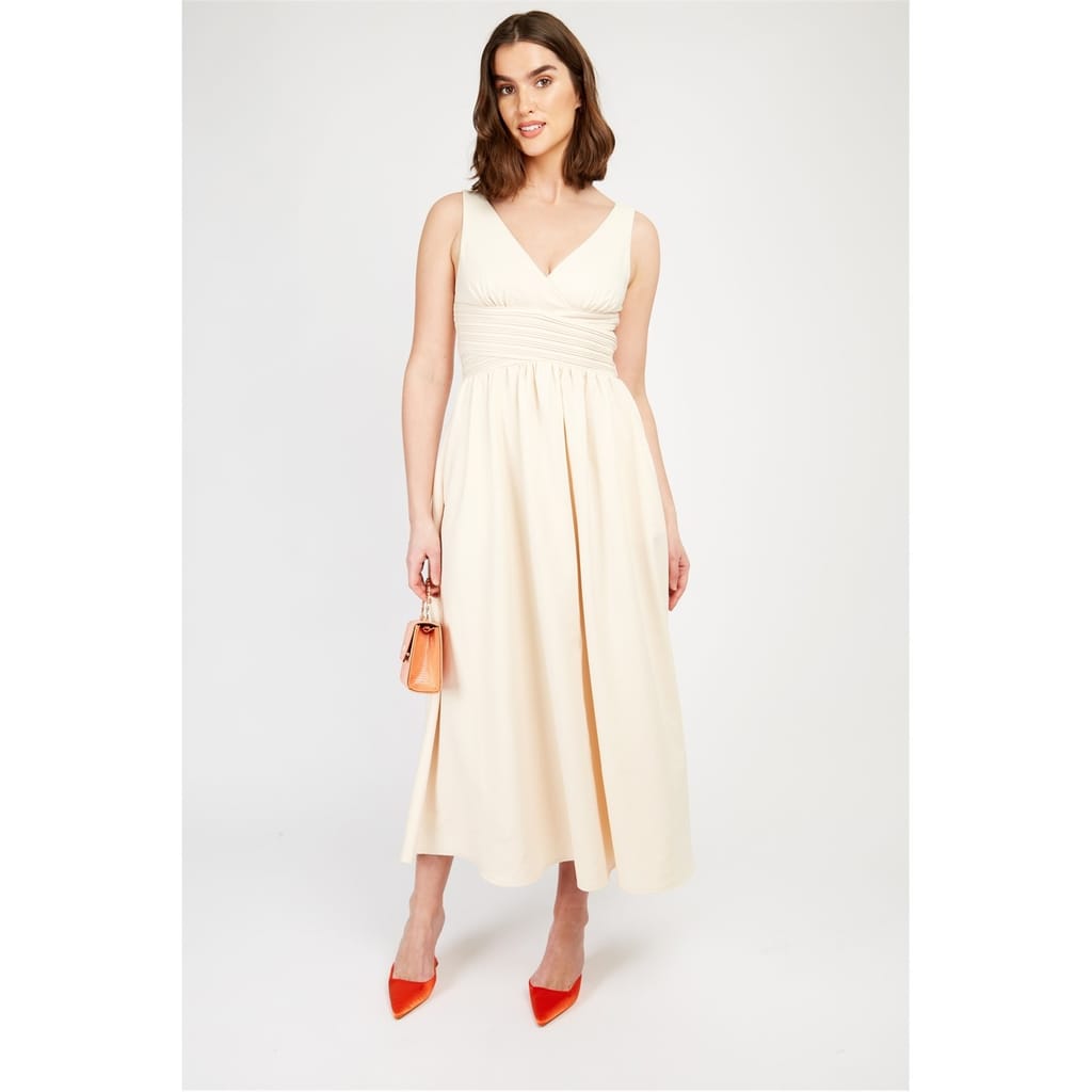 This Little Mistress maxi dress is a stunning A-line piece, featuring a V-neck and a straight hem. The solid pattern and ruched embellishments add a touch of elegance to this sleeveless design, making it a versatile addition to any wardrobe. -