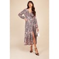 This Little Mistress wrap dress features a striking animal pattern, perfect for making a statement. The maxi length and asymmetrical hem add a touch of elegance, while the V-neckline enhances its sophisticated style. With long sleeves, this dress is ideal for various occasions, offering both comfort and style. -