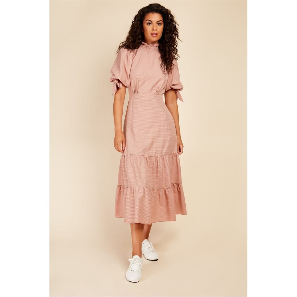 This Little Mistress maxi dress is a stunning tiered piece, featuring a high neck and short puff sleeves. The solid pattern and ruffle embellishments add a touch of elegance to this dress, making it a perfect choice for any occasion. -