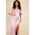 This Little Mistress maxi dress is a stunning gown featuring a v-neck and flutter sleeves. The asymmetrical hem adds a unique touch, while the polka dot pattern and ruffle embellishments enhance its elegance. Perfect for special occasions, this dress combines style and sophistication effortlessly. -