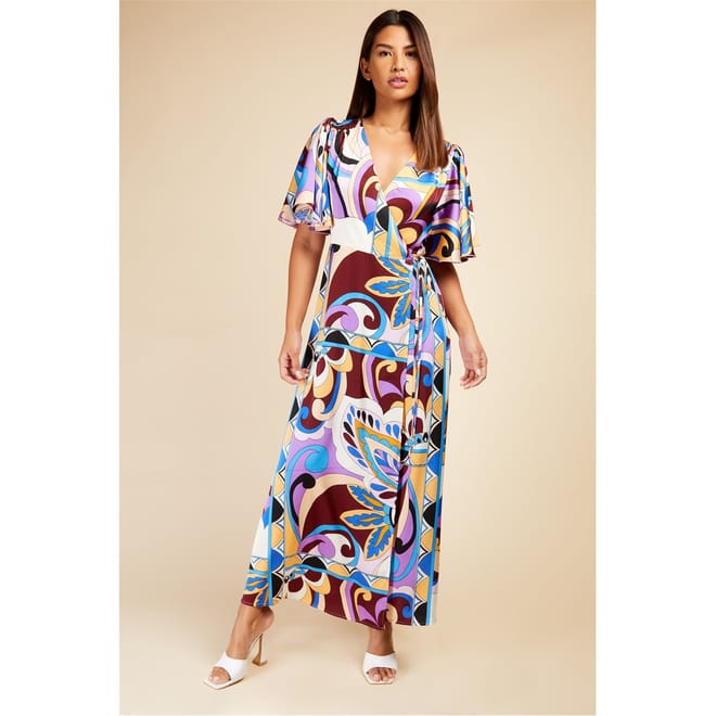 This Little Mistress wrap dress features a maxi length with an abstract pattern, offering a stylish and modern look. The dress is designed with a flattering V-neck and flutter sleeves, adding a touch of elegance. It has a straight hem and a tie closure, ensuring a comfortable fit. -