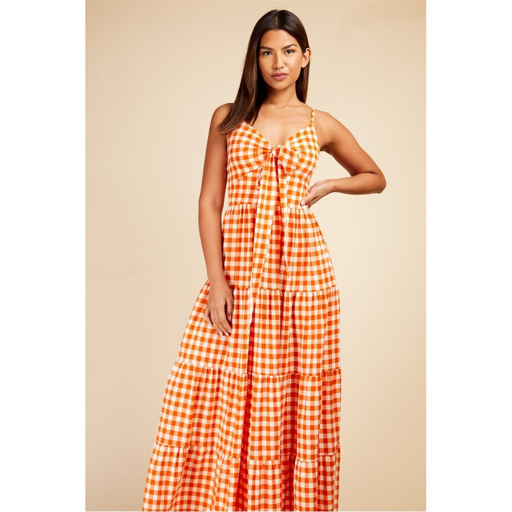 This Little Mistress maxi dress features a gingham pattern and a tiered design. The spaghetti strap neckline adds a delicate touch, while the tie front closure offers a stylish finish. The straight hemline completes the look, making it a versatile choice for various occasions. -