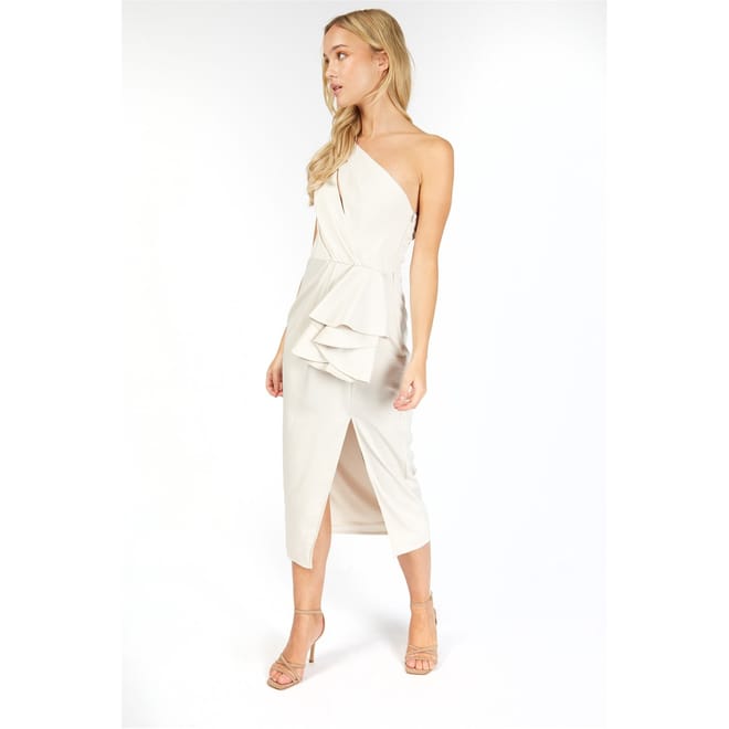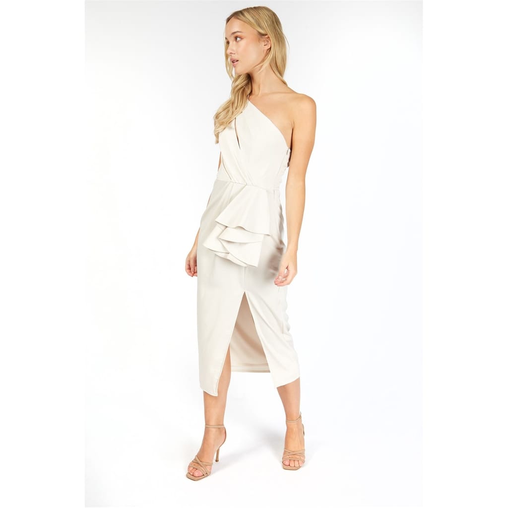 This Little Mistress maxi shift dress features a one-shoulder neckline and an asymmetrical hem, creating a striking silhouette. The slim fit enhances the solid pattern, while ruffle embellishments add a touch of elegance. Perfect for making a statement, this dress combines modern design with classic elements. -