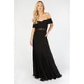 This Little Mistress maxi gown is a stunning choice for elegant occasions. Featuring an off-the-shoulder neckline, it showcases a solid pattern with delicate lace trim embellishments. The sleeveless design enhances its sophisticated appeal, making it a timeless addition to your wardrobe. -