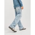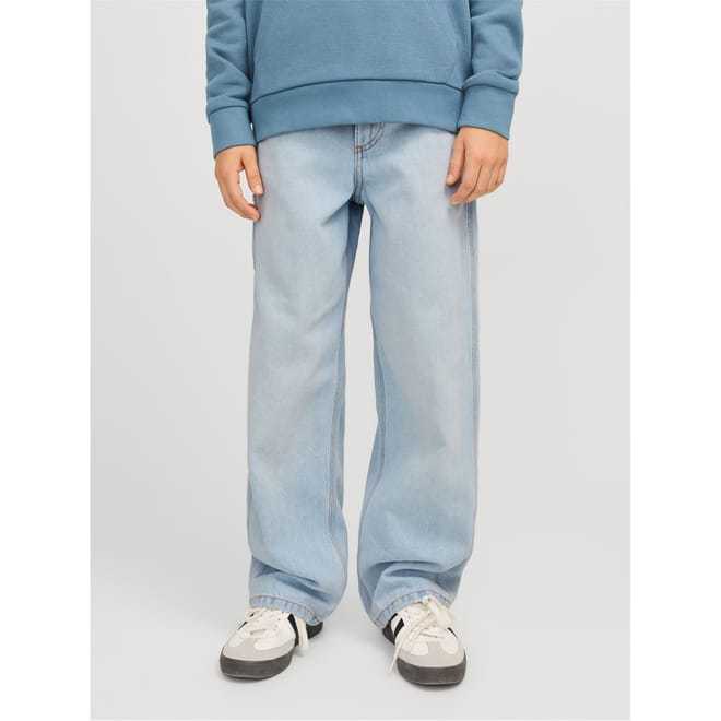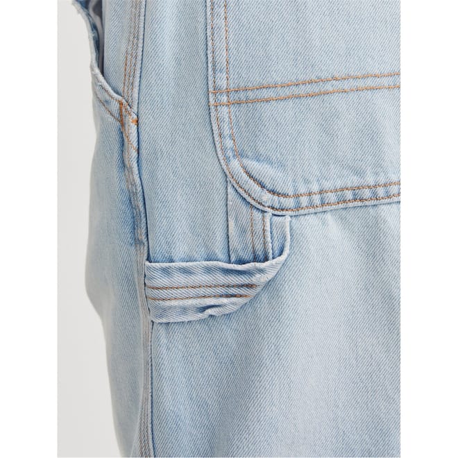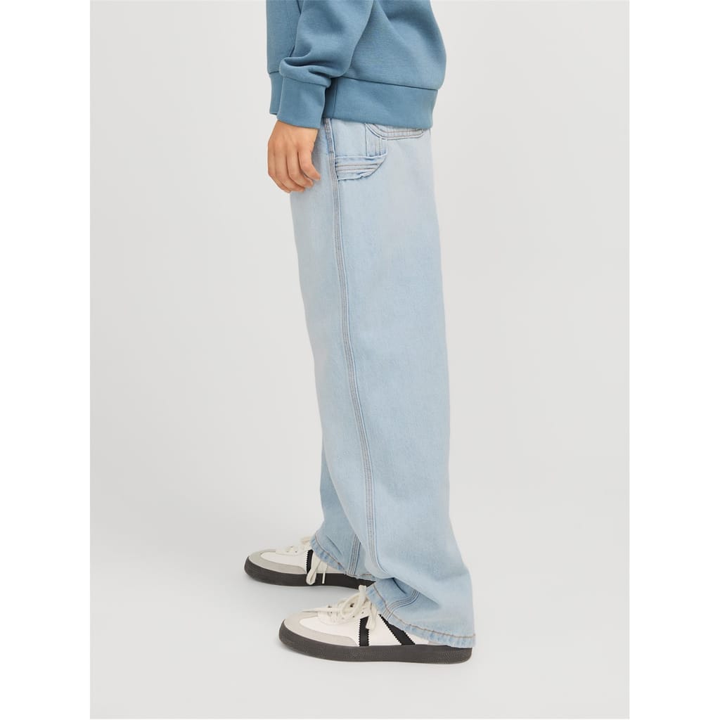 The Alex carpenter jeans by Jack & Jones feature a light wash and wide leg cut, offering a relaxed wide fit. Designed with practical elements like a zip fly, front button, and belt loops, these jeans are enhanced with pocket and patch pocket embellishments, along with detailed stitching for added style. -