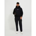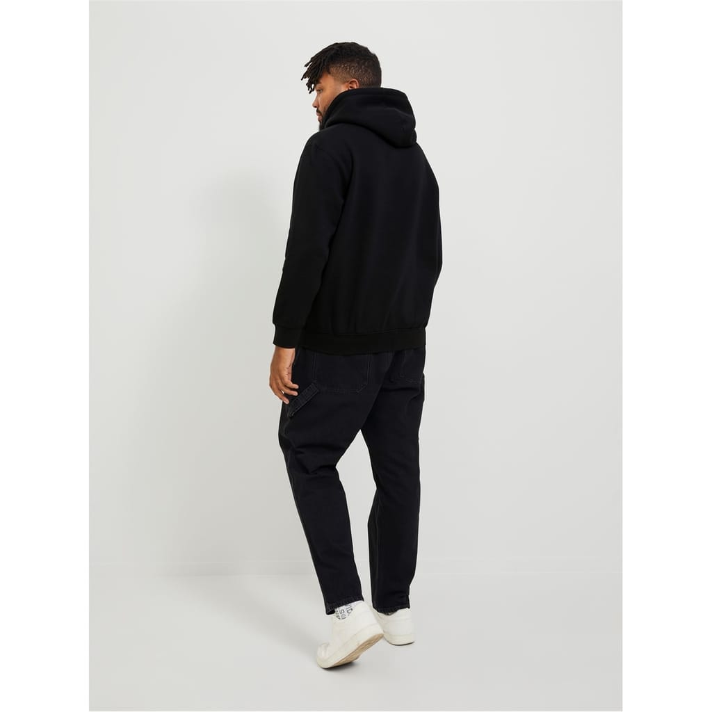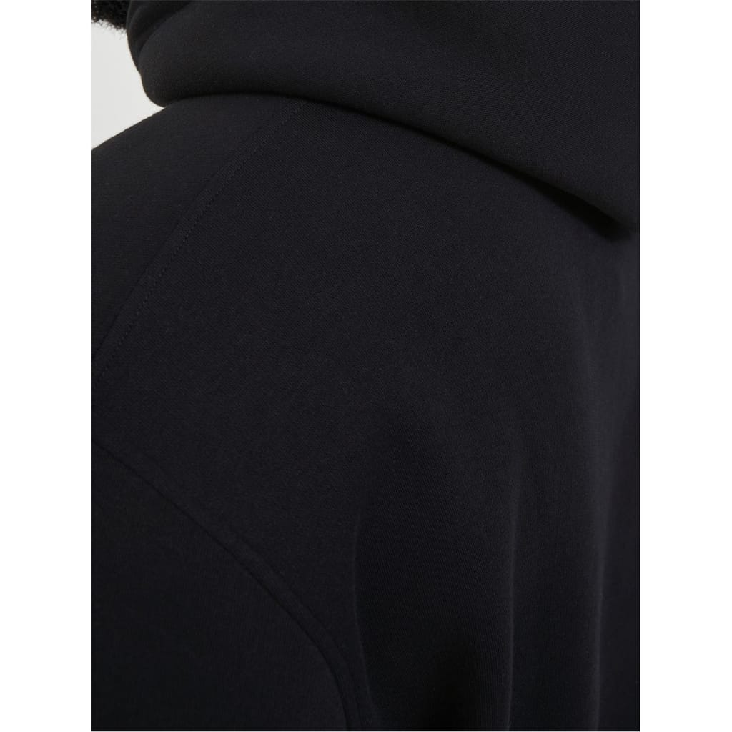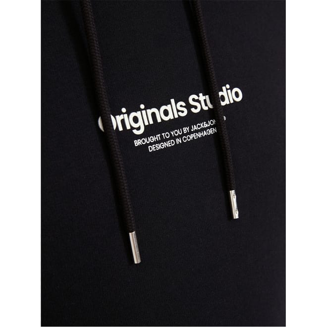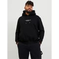 This Jack & Jones top features a hooded neck and long sleeves, offering a regular fit for all seasons. The solid pattern is complemented by a front logo and lettering graphic, adding a stylish touch. It includes a kangaroo pocket and ribbed cuffs for added comfort and functionality. -