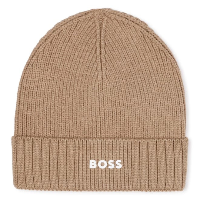 The Boss beanie is a stylish choice for infants, children, and juniors. Crafted with a ribbed knit design, it features a distinctive logo embellishment and lettering graphic. This beanie offers a comfortable fit, making it a practical and fashionable accessory for young ones. -