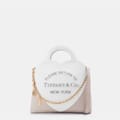 This Tiffany tote bag showcases a sophisticated color block pattern, enhanced with elegant lettering graphics. The design features a secure snap button and zipper closure, ensuring your belongings are safe. Embellished with a distinctive logo and chain detailing, this bag combines style and functionality, making it a perfect accessory for any occasion. -