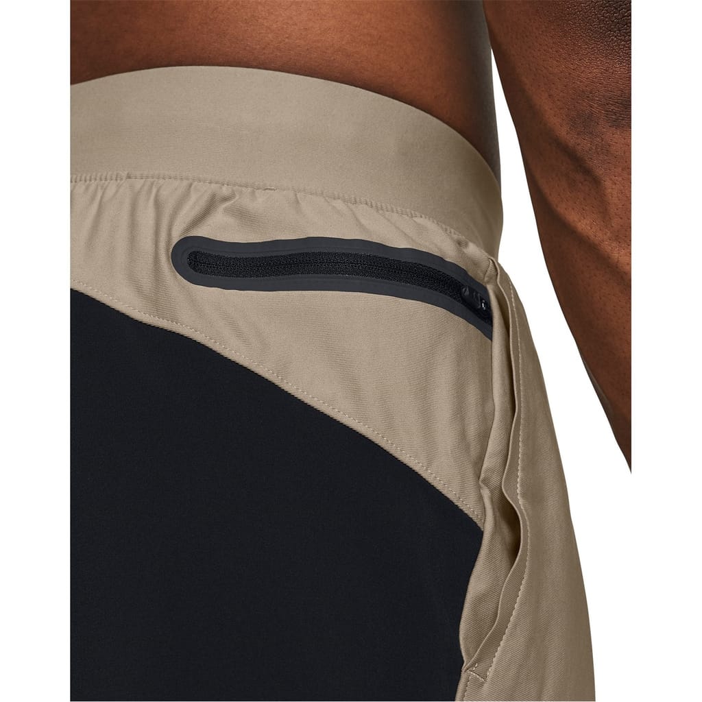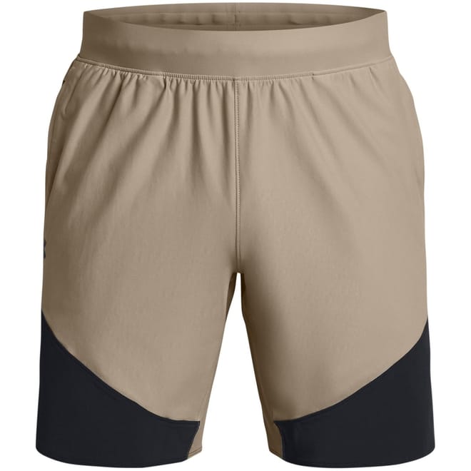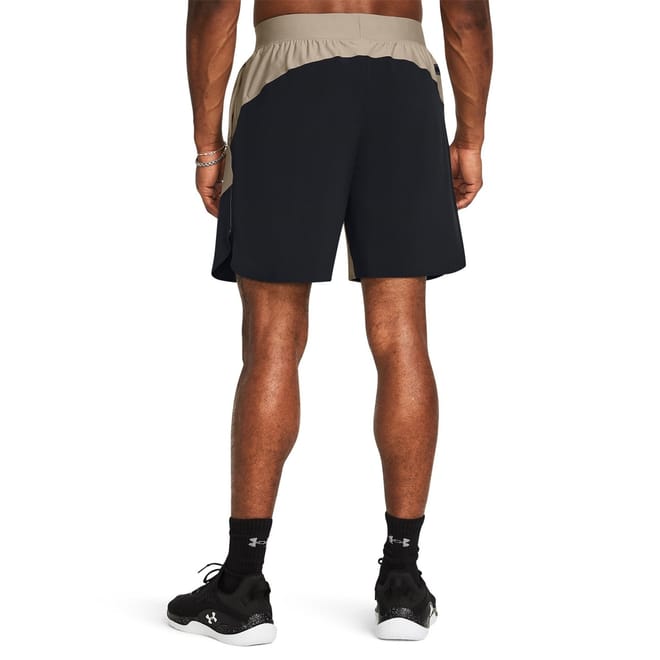 Under Armour shorts feature a color block pattern and are designed for both casual and activewear collections. These hybrid performance bermuda shorts are ideal for running, with a convenient drawstring closure. Embellished with a logo and pockets, they offer a stylish and functional choice for athletic activities. -