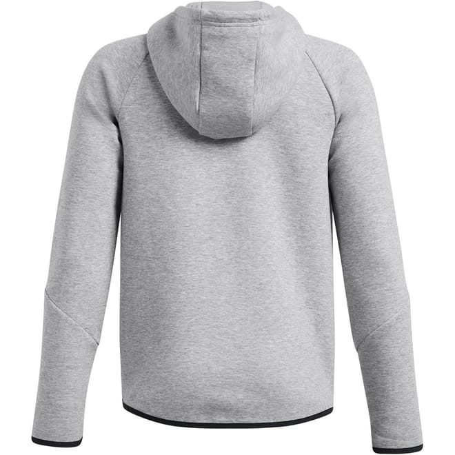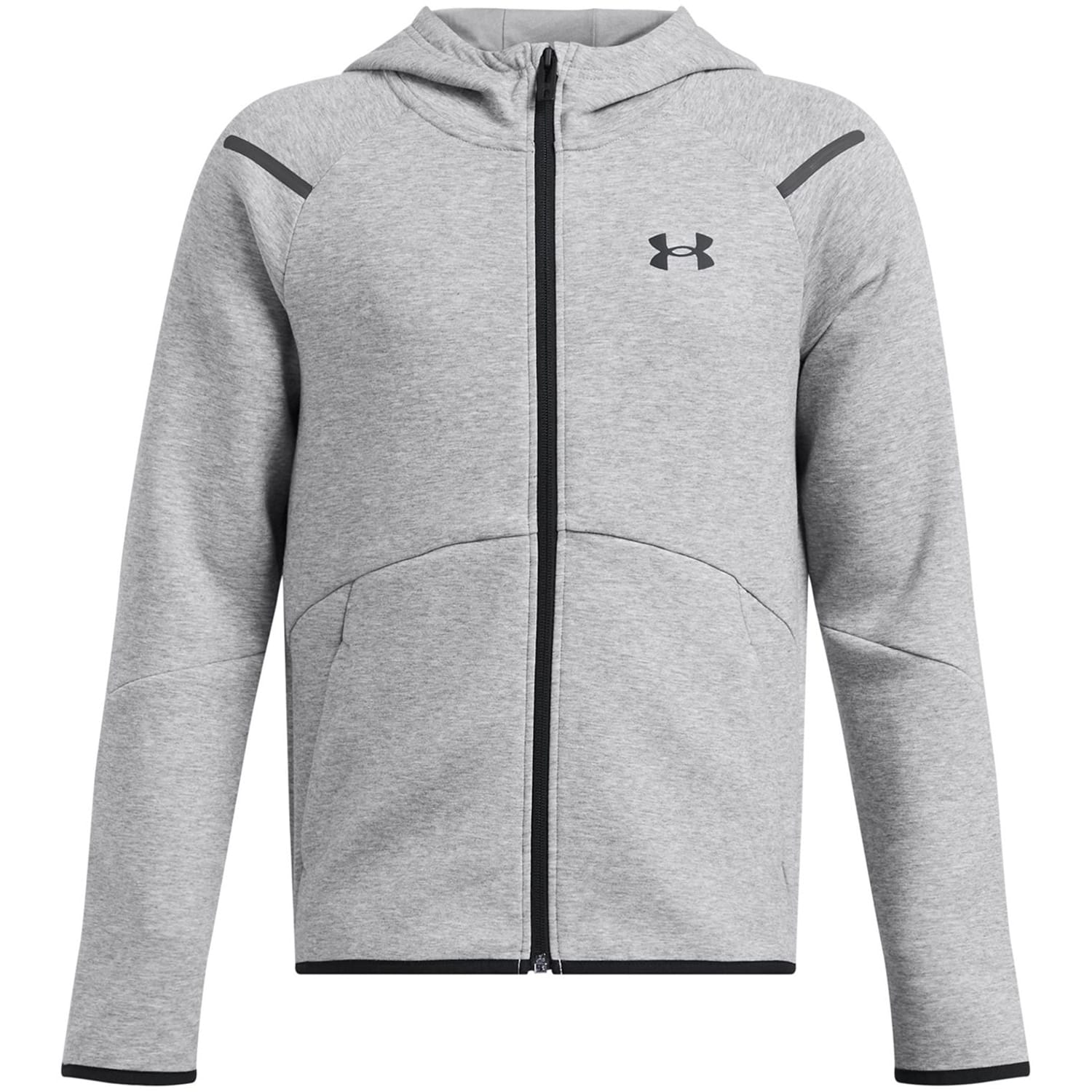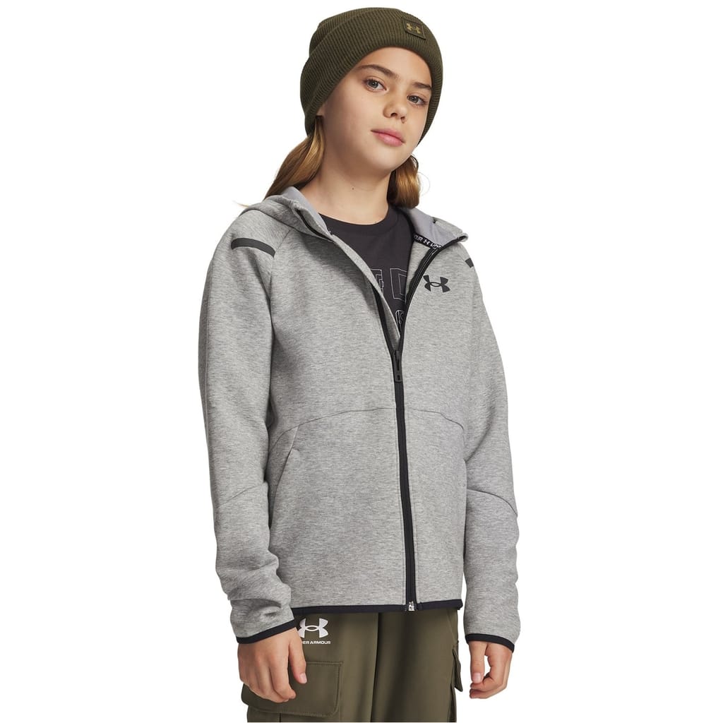 This Under Armour sweatshirt jacket from the activewear collection features a hooded neckline and a full zipper closure. Designed with raglan sleeves and ribbed cuffs, it offers a regular fit for comfort. The solid pattern is complemented by a logo embellishment, while the ribbed hem adds a touch of style. -