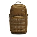 This Under Armour backpack is designed for sporting activities, featuring a secure zipper and buckle closure. It includes a top handle for easy carrying and a front pocket for additional storage. The backpack is adorned with the brand's logo, adding a touch of style to its functional design. -