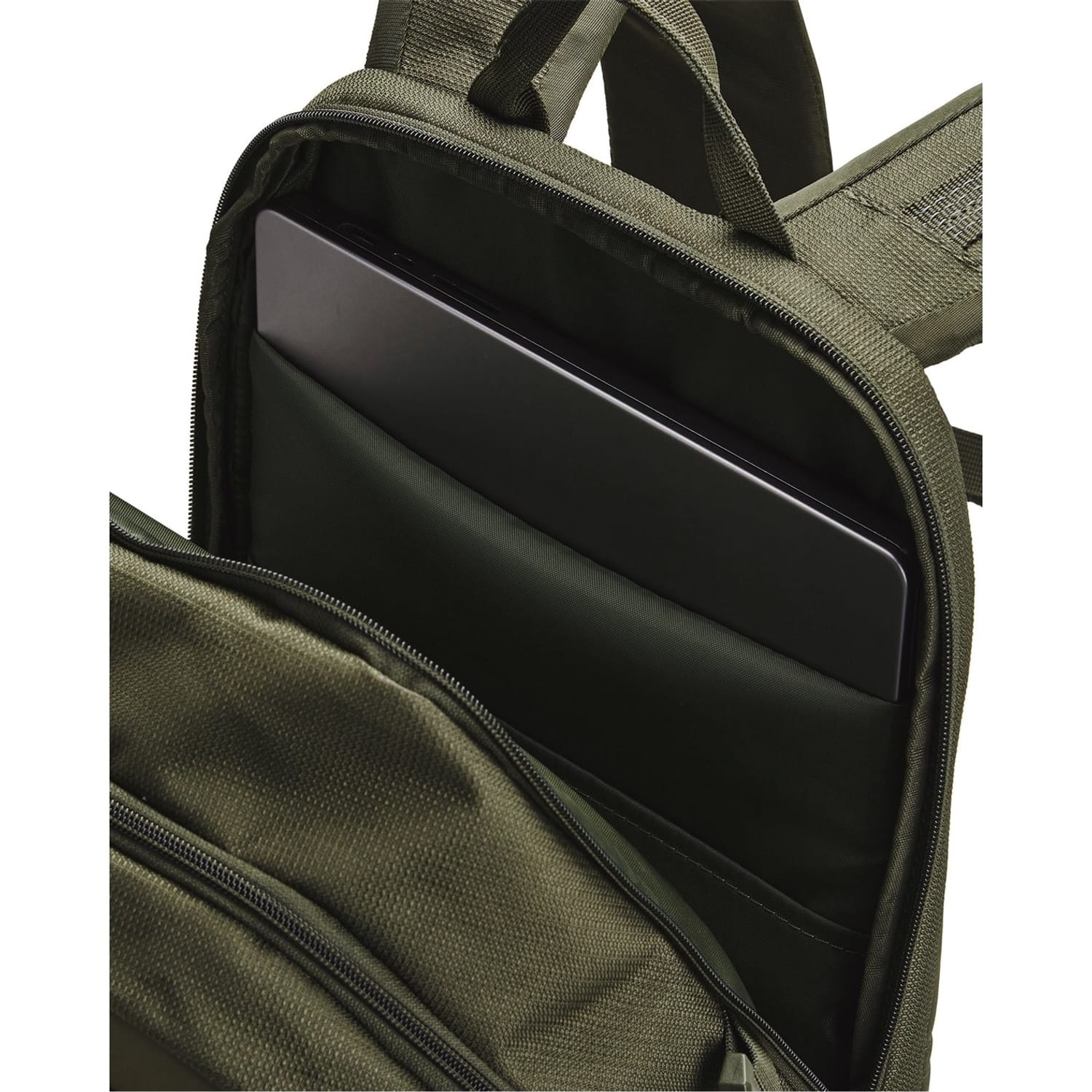 The Under Armour backpack is designed for sporting activities, featuring a secure zipper and buckle closure. It includes a top handle for easy carrying. The backpack is equipped with multiple pockets, including mesh and zipped pockets, providing ample storage space. The design is completed with a prominent logo, making it both functional and stylish. -
