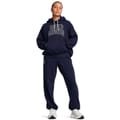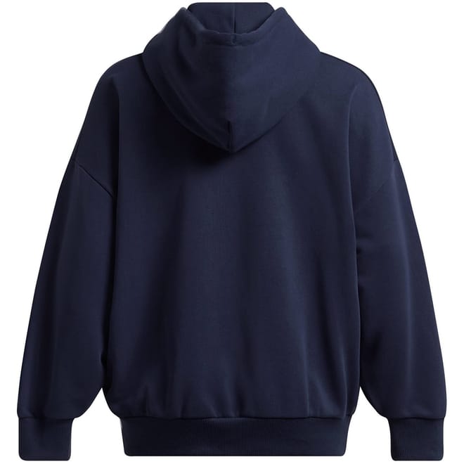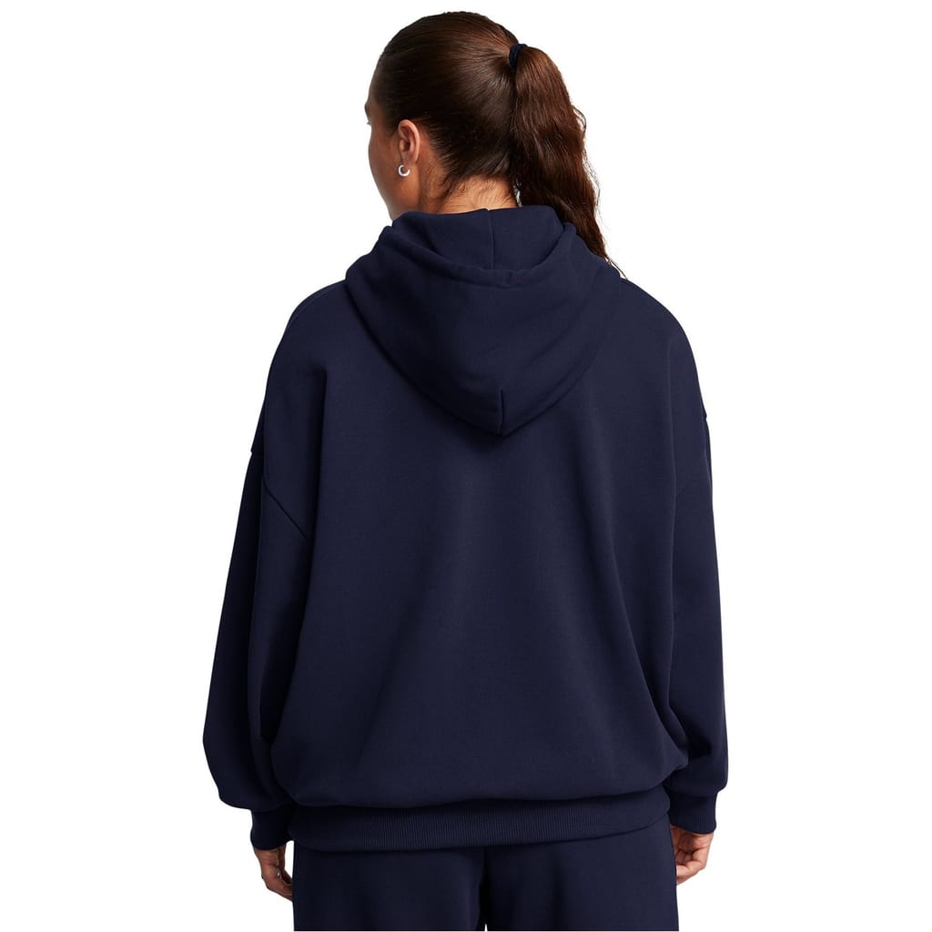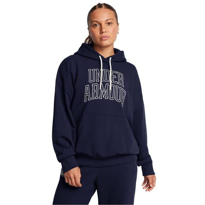 Discover the Under Armour top, featuring a hooded neck and long sleeves with a drop shoulder design. This oversized fit piece is crafted with ribbed cuffs for added comfort. The solid pattern is complemented by a subtle logo embellishment, making it a versatile addition to your wardrobe. -
