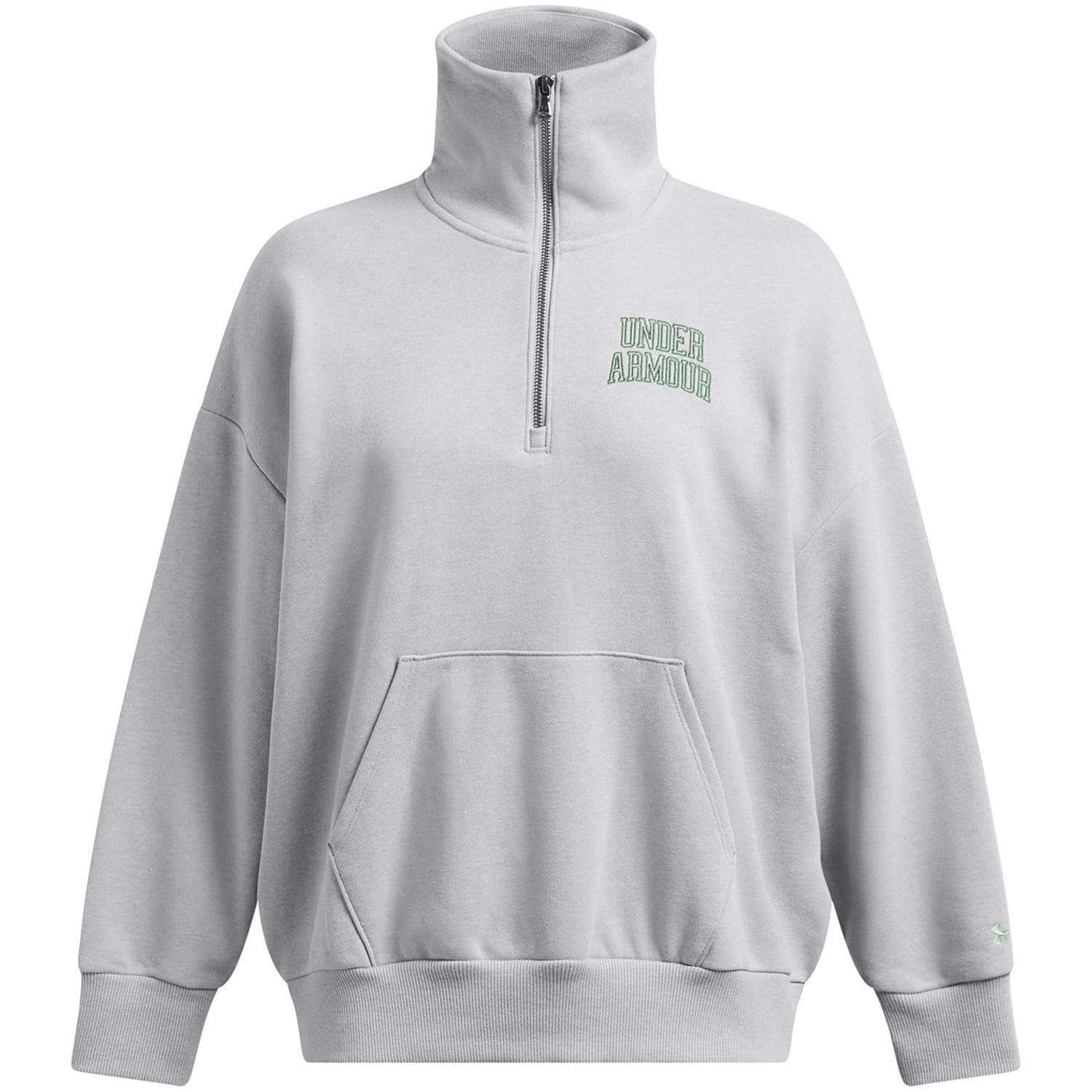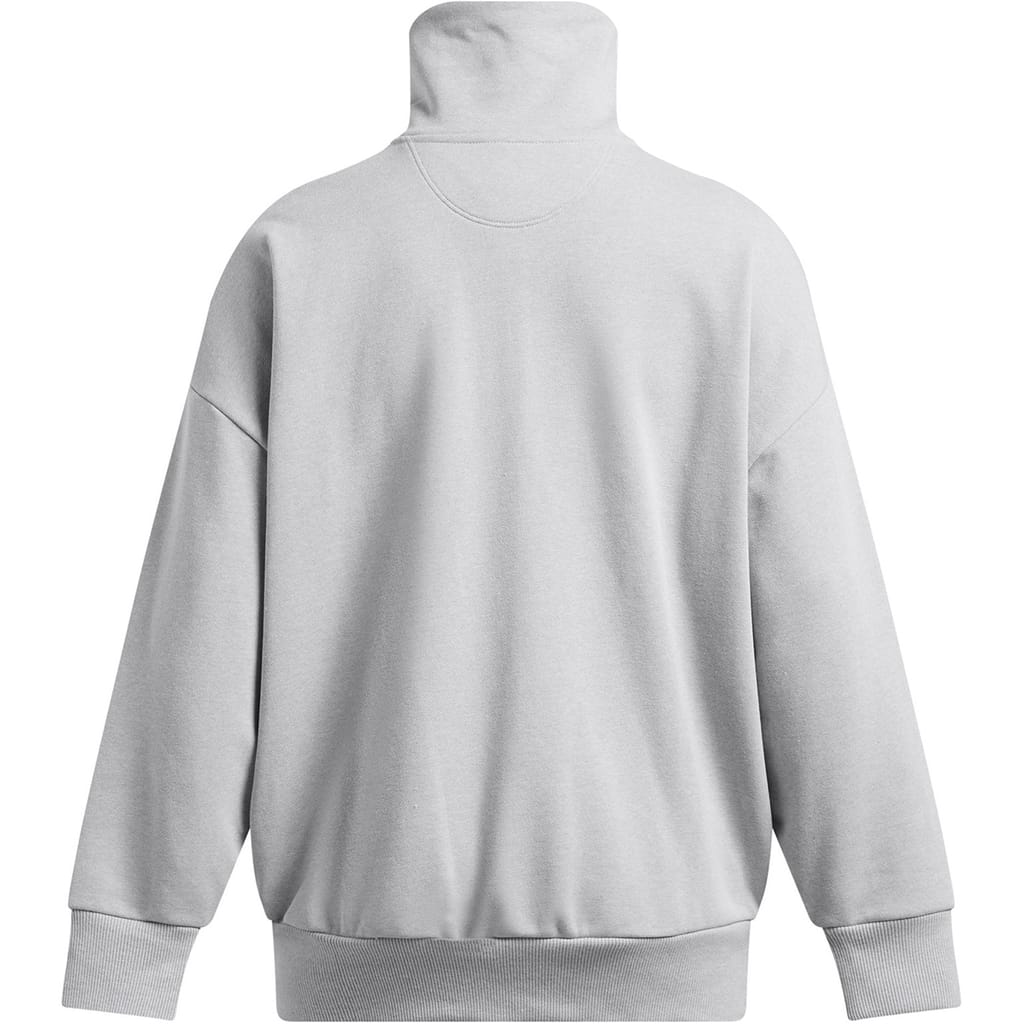 This Under Armour top features a hooded neck and a convenient zipper closure. Designed with long sleeves and a drop shoulder style, it offers an oversized fit for a relaxed look. The solid pattern adds a classic touch, while ribbed cuffs provide a snug finish. -