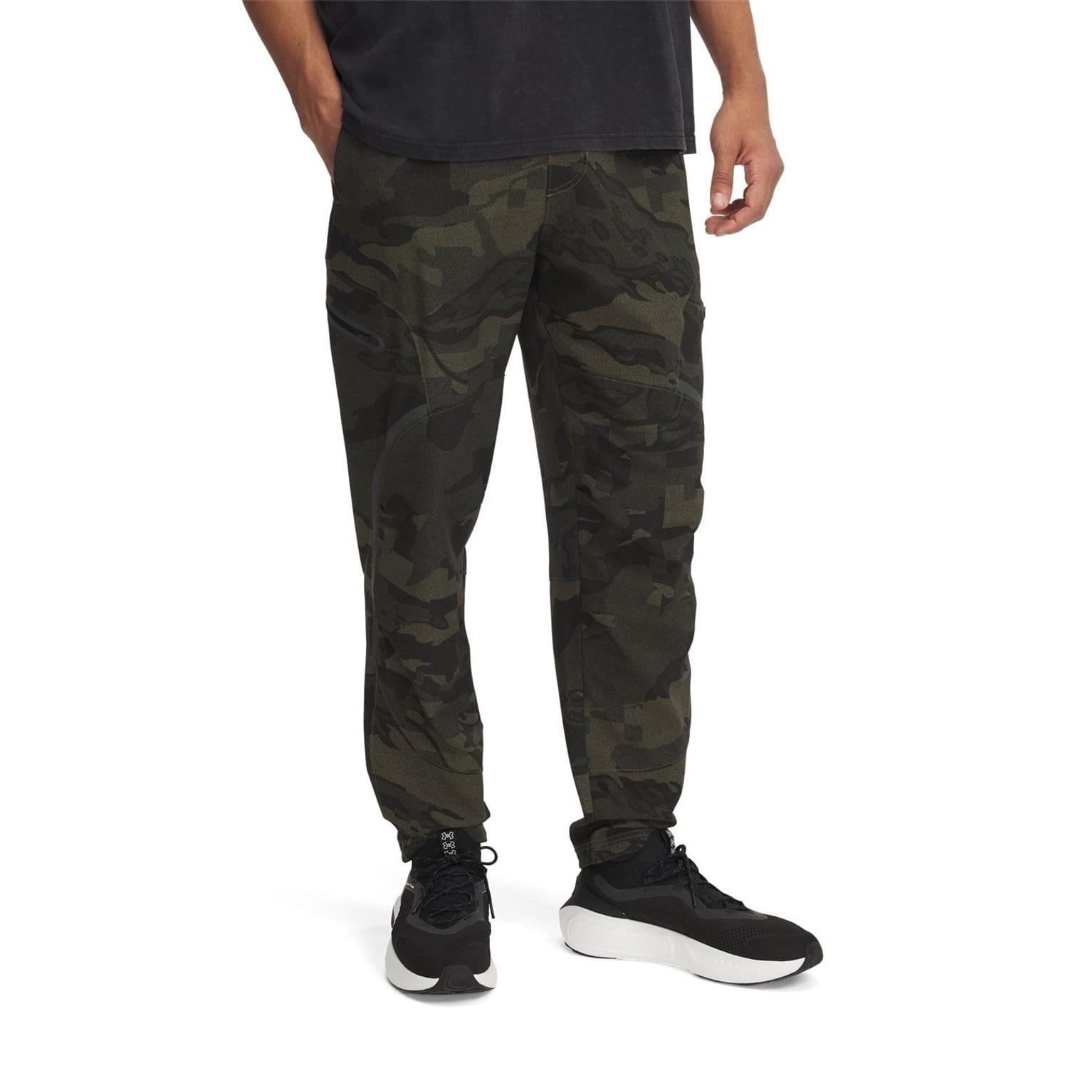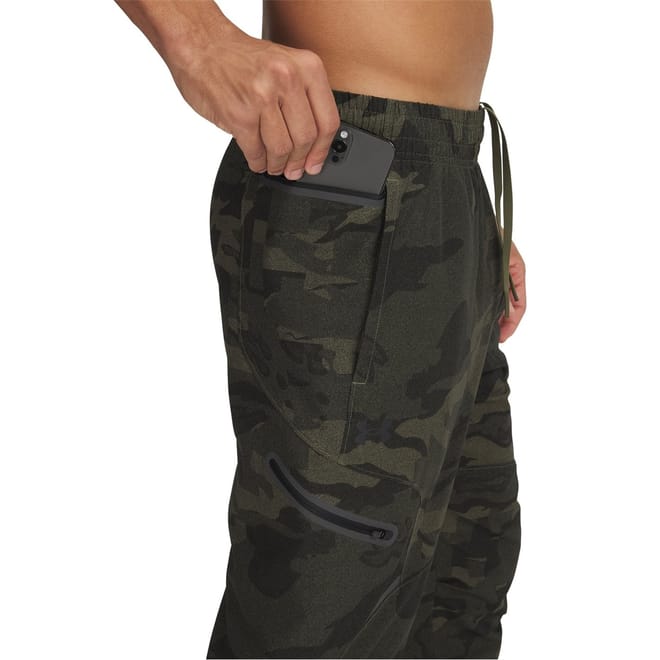 Under Armour cargo pants feature a camo pattern and a regular fit, perfect for casual collections. These woven pants come with a drawstring closure and are equipped with side and zipped pockets for added functionality. -