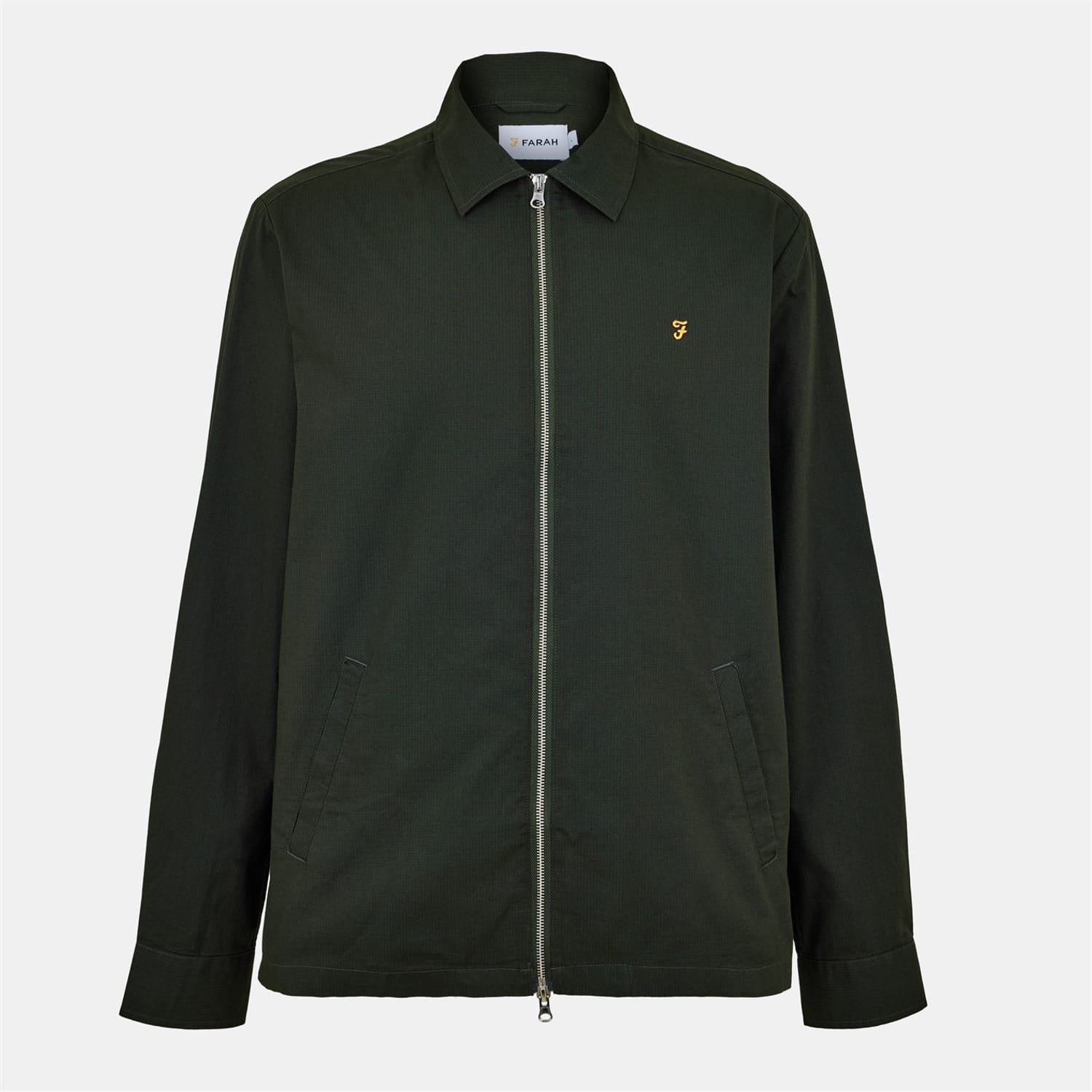 This Farah overshirt features a solid pattern and a regular fit, offering a classic look. It is designed with a shirt collar and a straight hem, providing a neat finish. The jacket includes a zipper closure and is adorned with a logo embellishment, adding a subtle brand touch. -