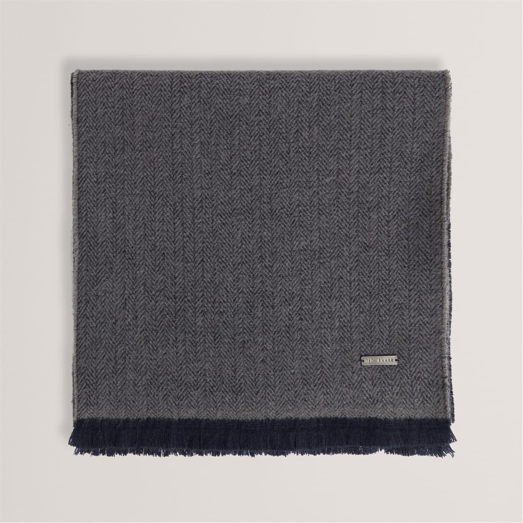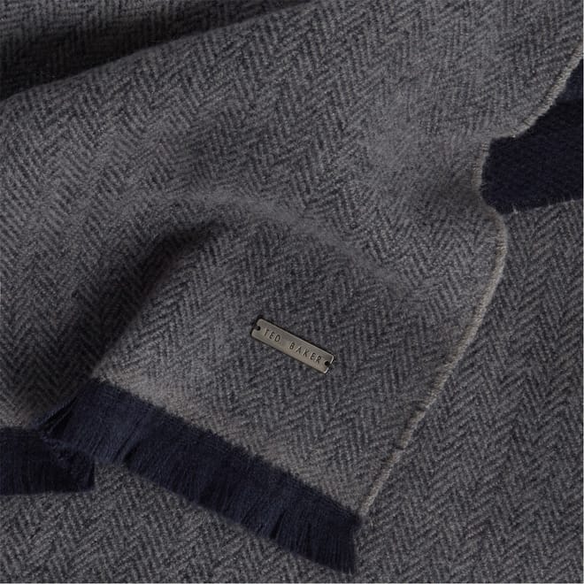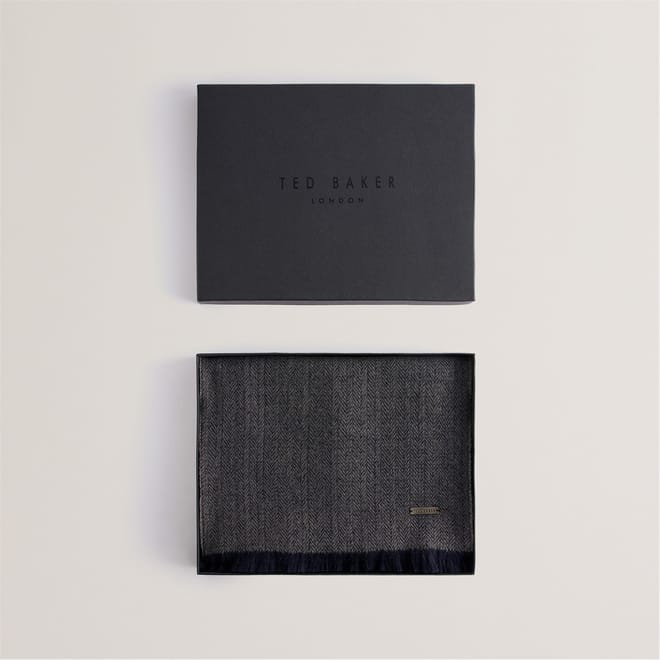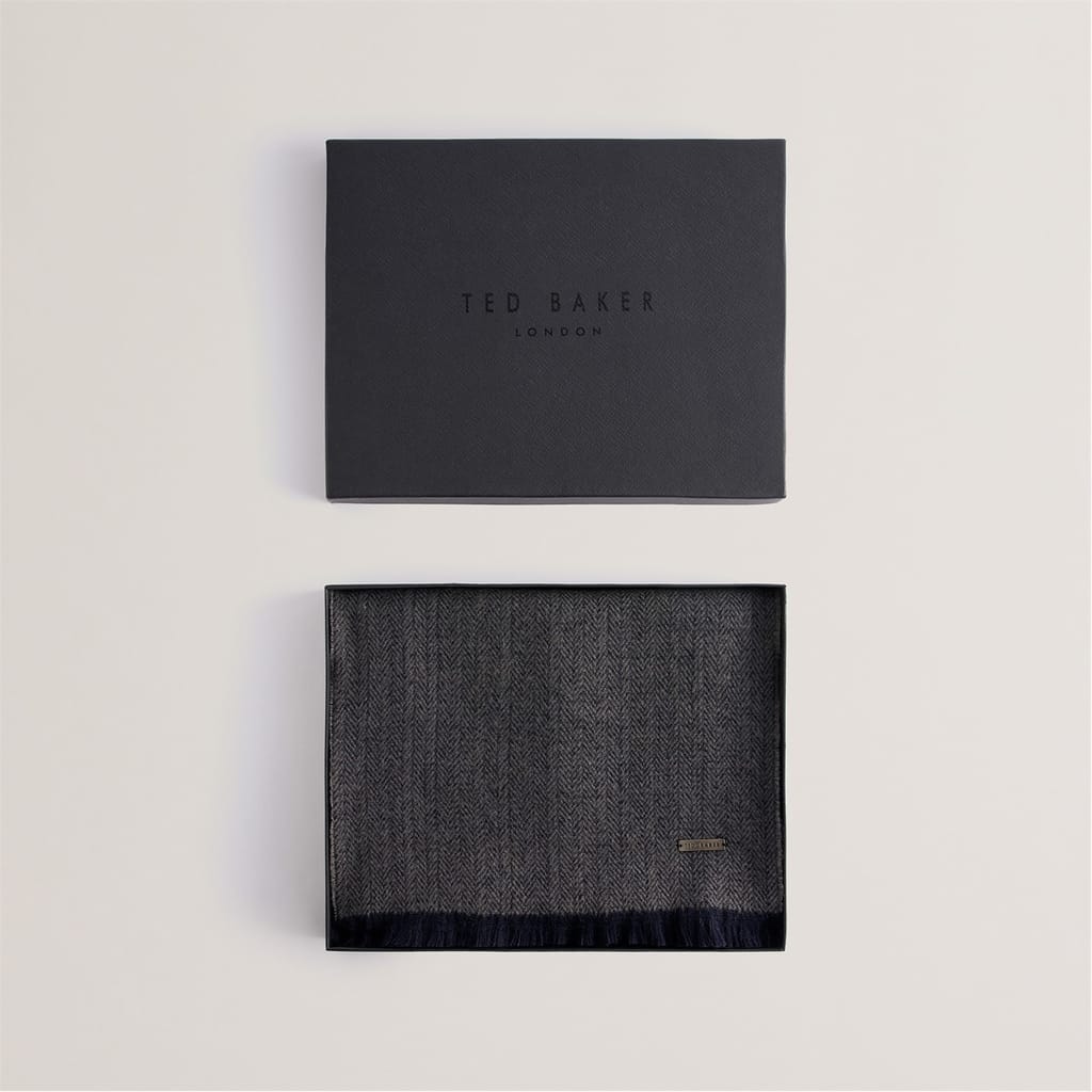 Discover the Ted Baker oblong scarf, a stylish addition to your wardrobe. Featuring a classic herringbone pattern, this scarf is adorned with metal branding and fringe embellishments, adding a touch of sophistication. Perfect for elevating your look with its elegant design and quality craftsmanship. -