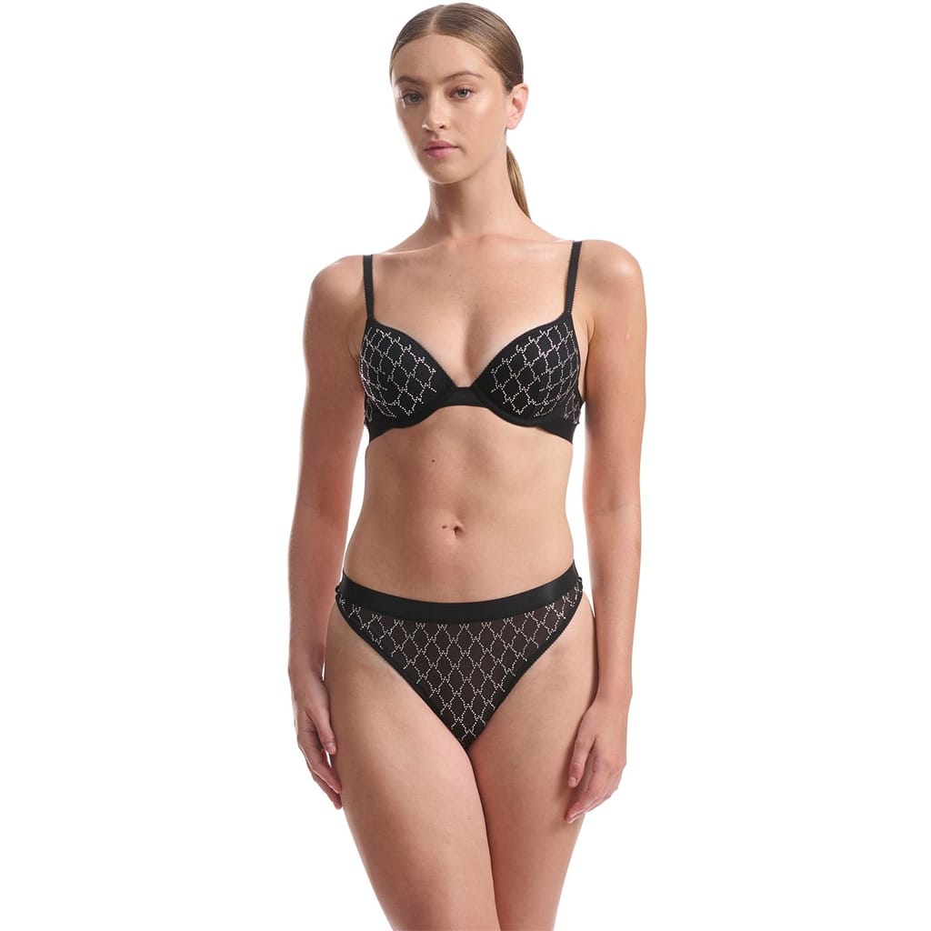 This thong is an elevated take on a classic silhouette. Made from a stretch W logo embroidered sheer mesh, this thong provides the best overall comfort and fit with no visible pantry lines. This great fit is made extra special with an all over shiny crystal rhinestone W Logo!