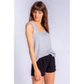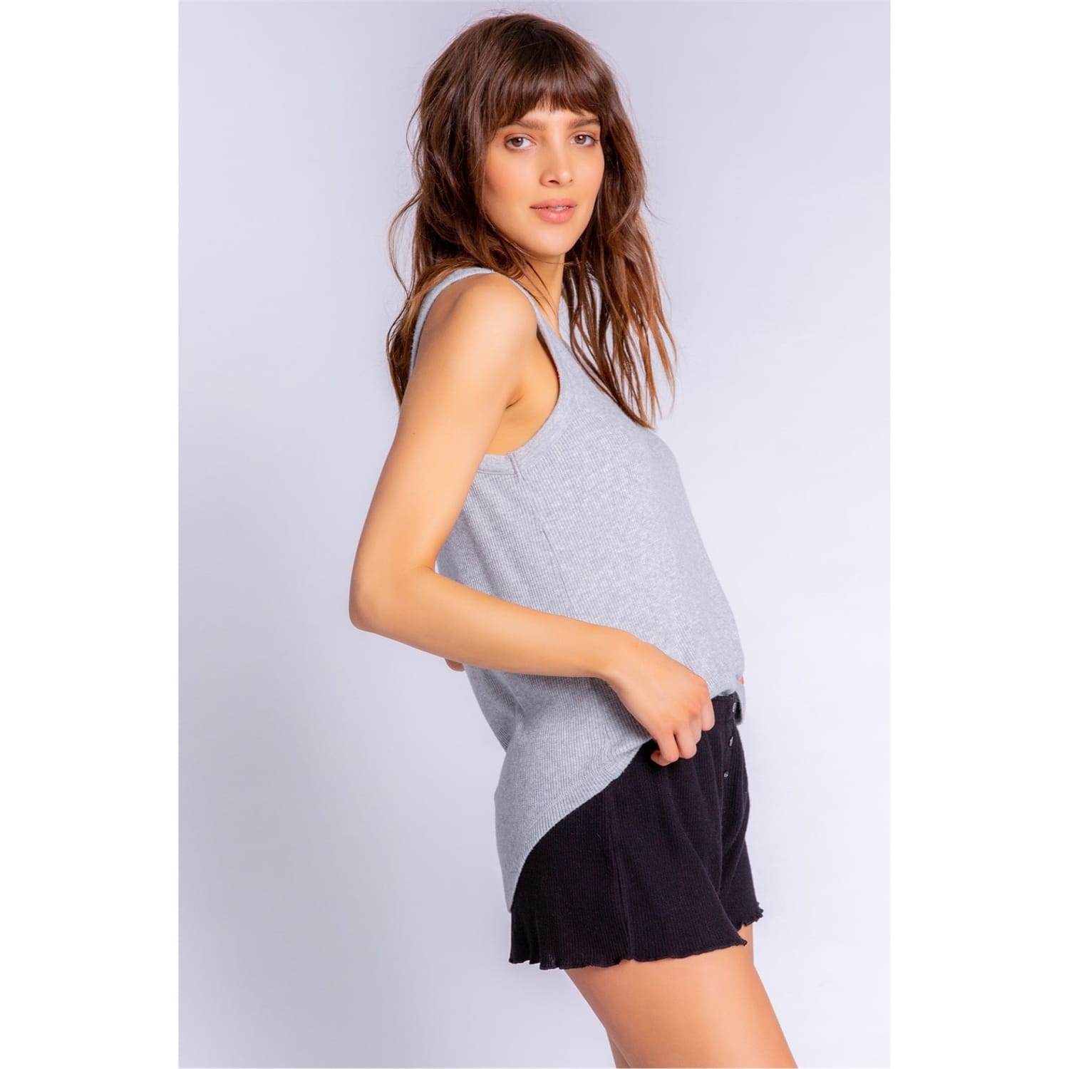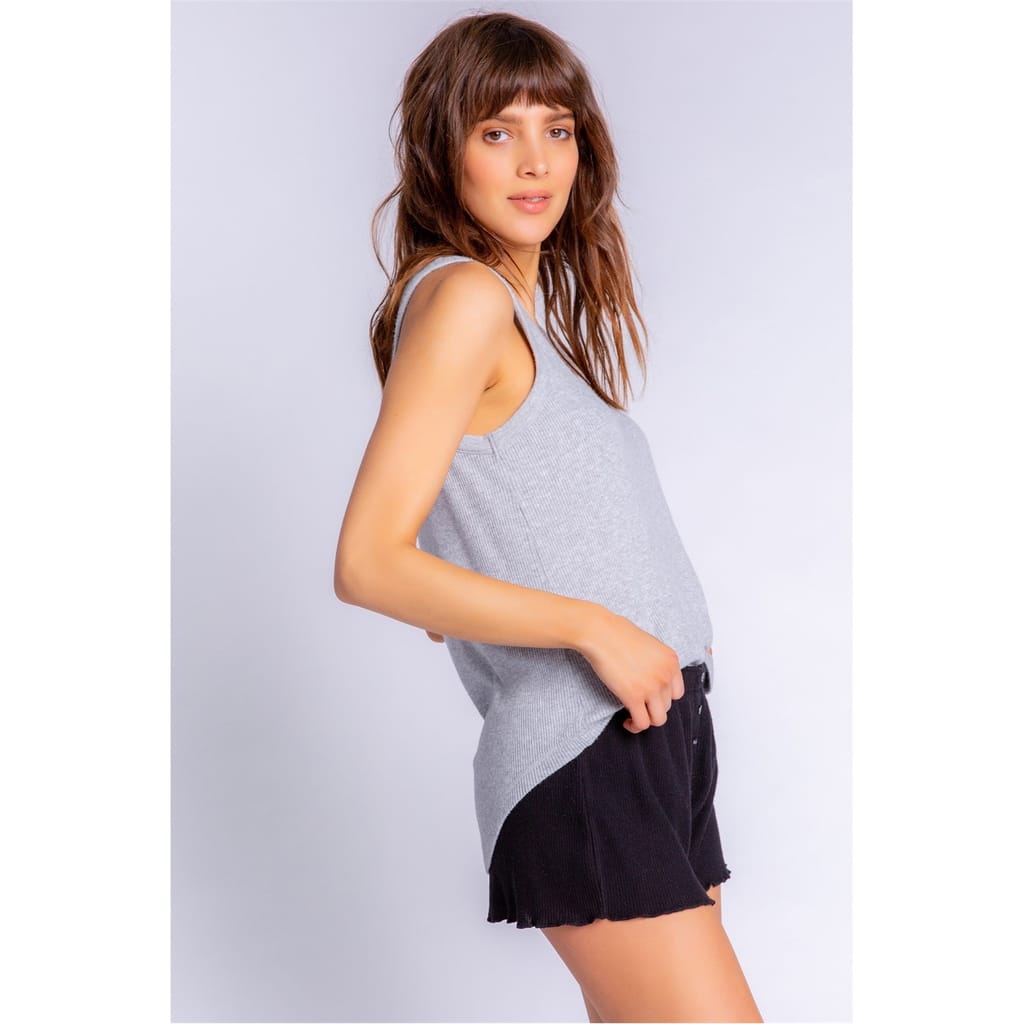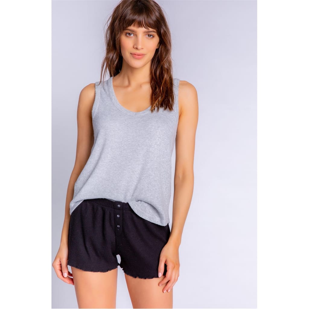 Sleep ribbed short in 2x2 peachy rib with merrowed hem and 3-faux button fly. -