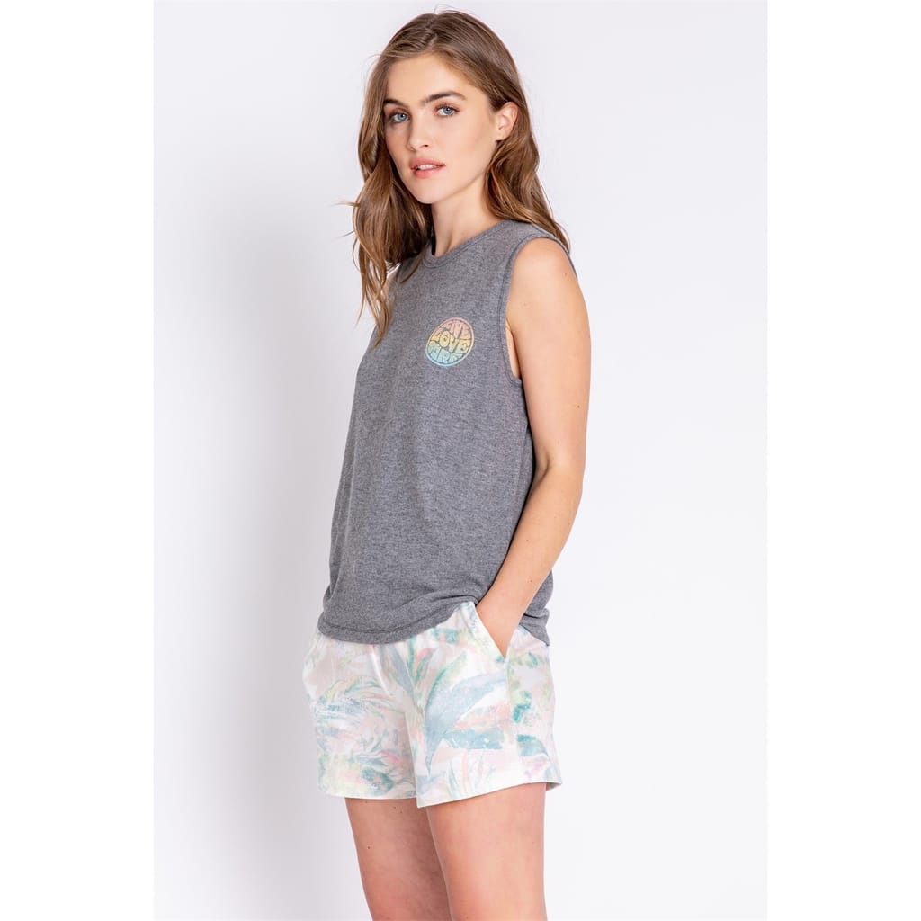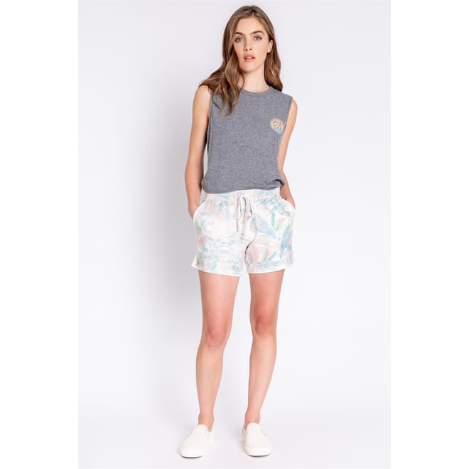 Lounge short in peachy distressed tropical print. Relaxed fit with 2 side pockets & tie waist. -