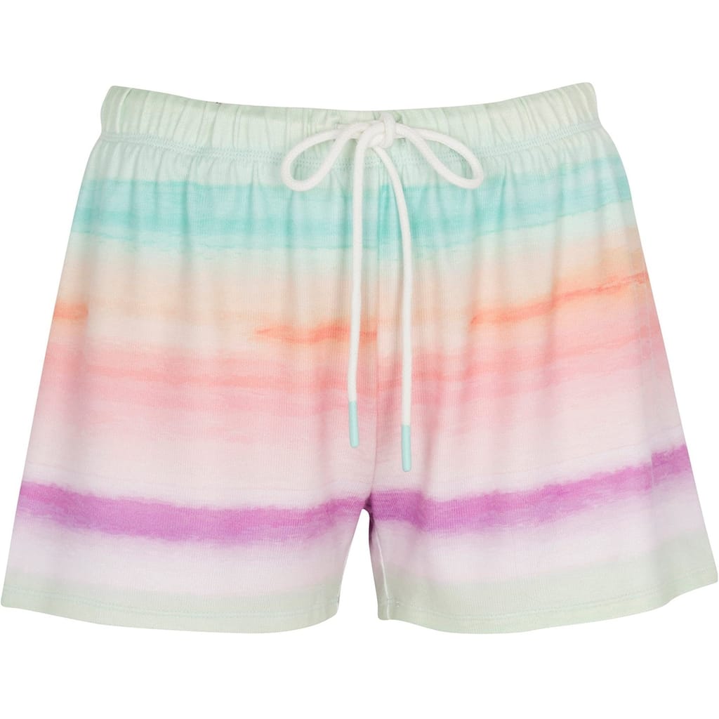 Ombre' gradient print lounge short in violet-pink-coral-mint shades. Enjoy a restful night or day in our jersey shorts featuring a rainbow print on ivory fabric. With an adjustable top and tie-waist shorts, bringing both comfort and contribution to your sleep or everyday wear. -