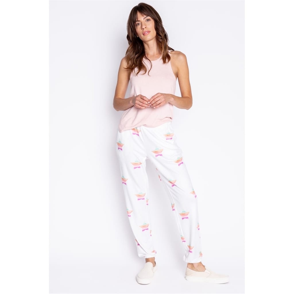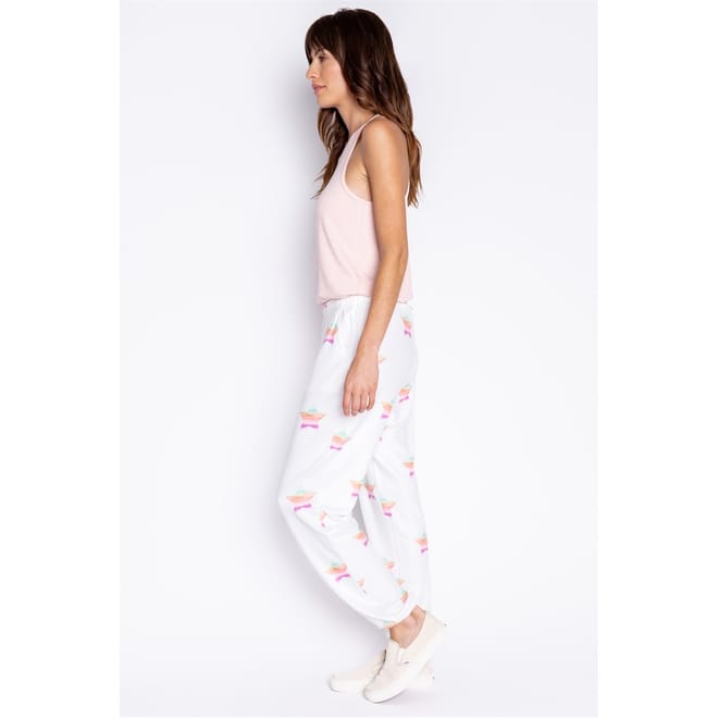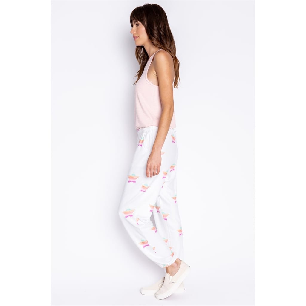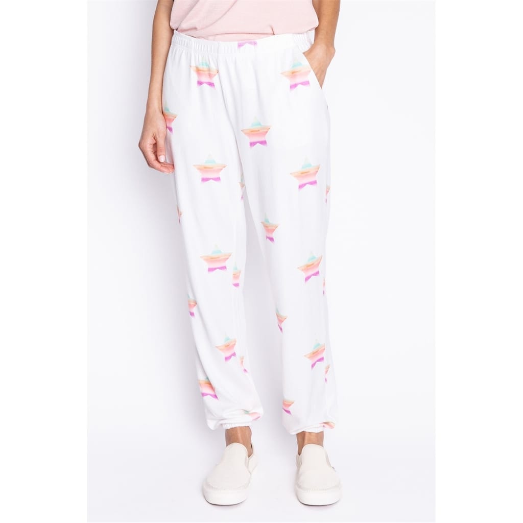 Crafted from soft, washed vintage French Terry, this cuffed pant features a relaxed, cozy fit perfect for lazy afternoons and warm nights. Playful Soft ivory track bottoms, with multi-colour gradient star prints and a ribbed elasticated waist.